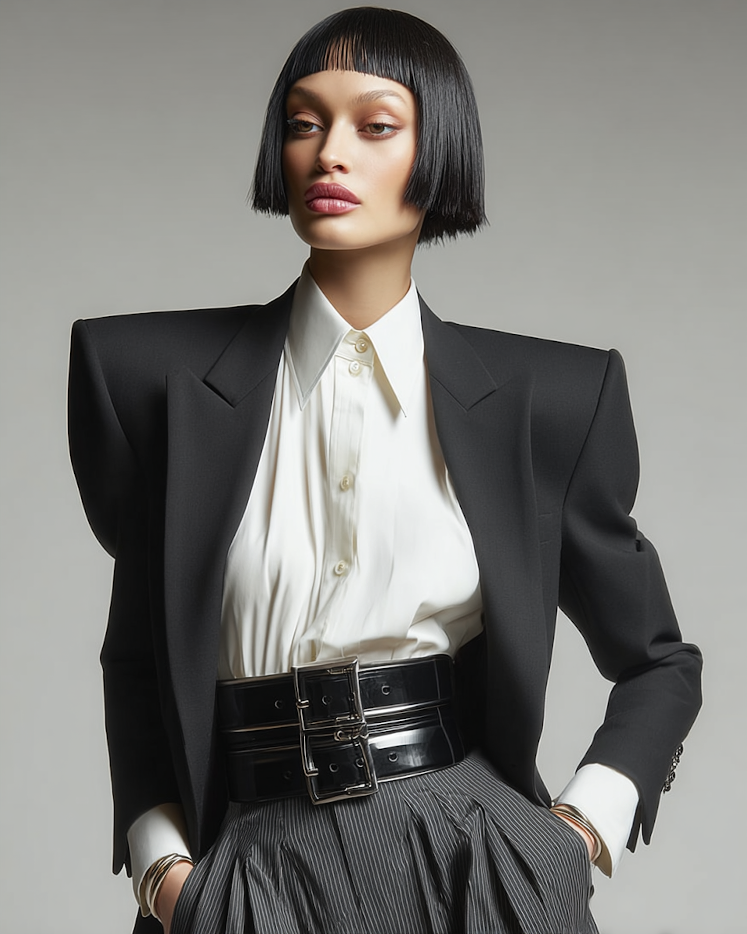 Stylish individual in a structured blazer, white shirt, and pinstripe skirt, accessorized with a bold black belt and sleek hairstyle.