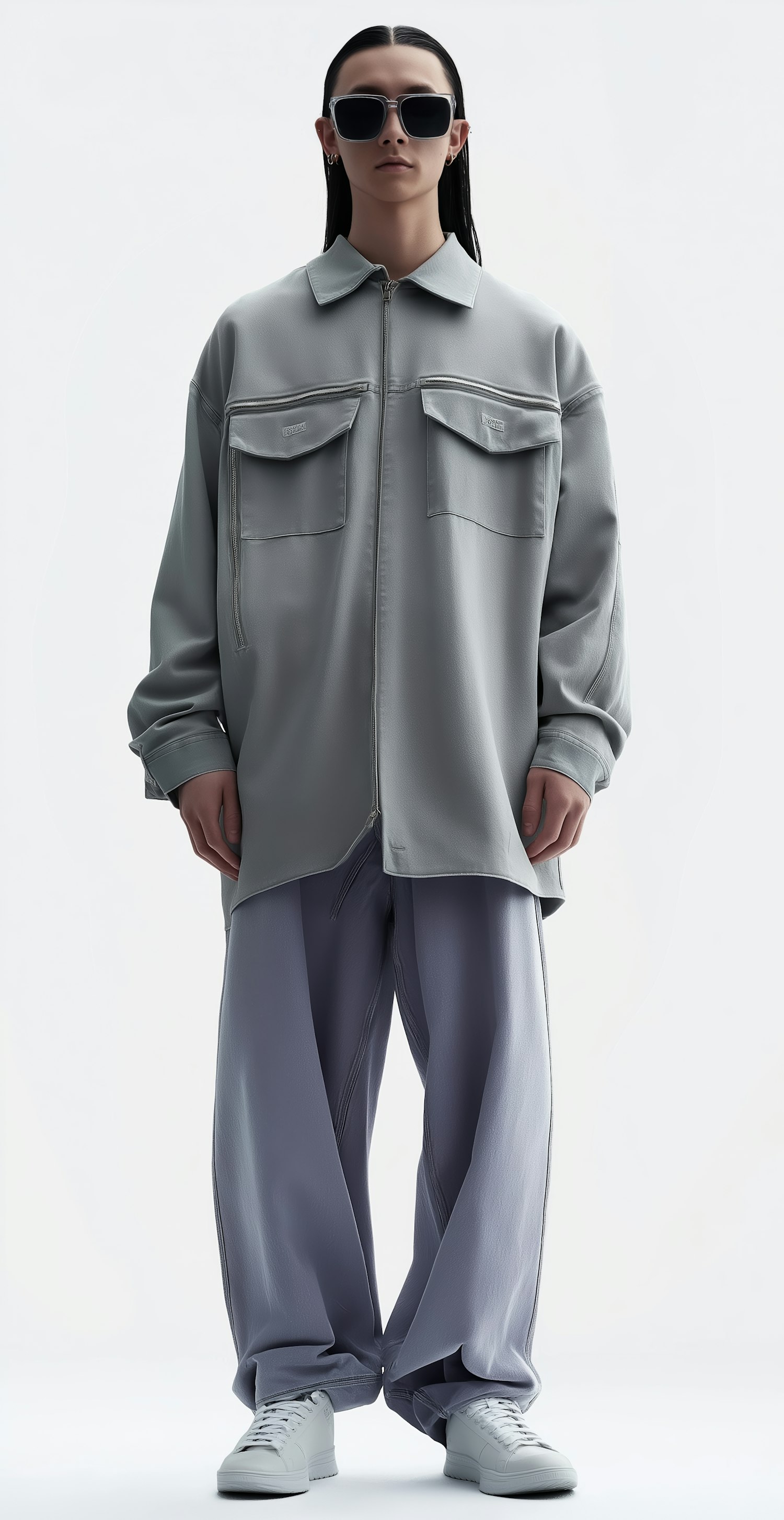 Stylish individual in oversized gray outfit with sunglasses, showcasing modern fashion in a minimalist setting.