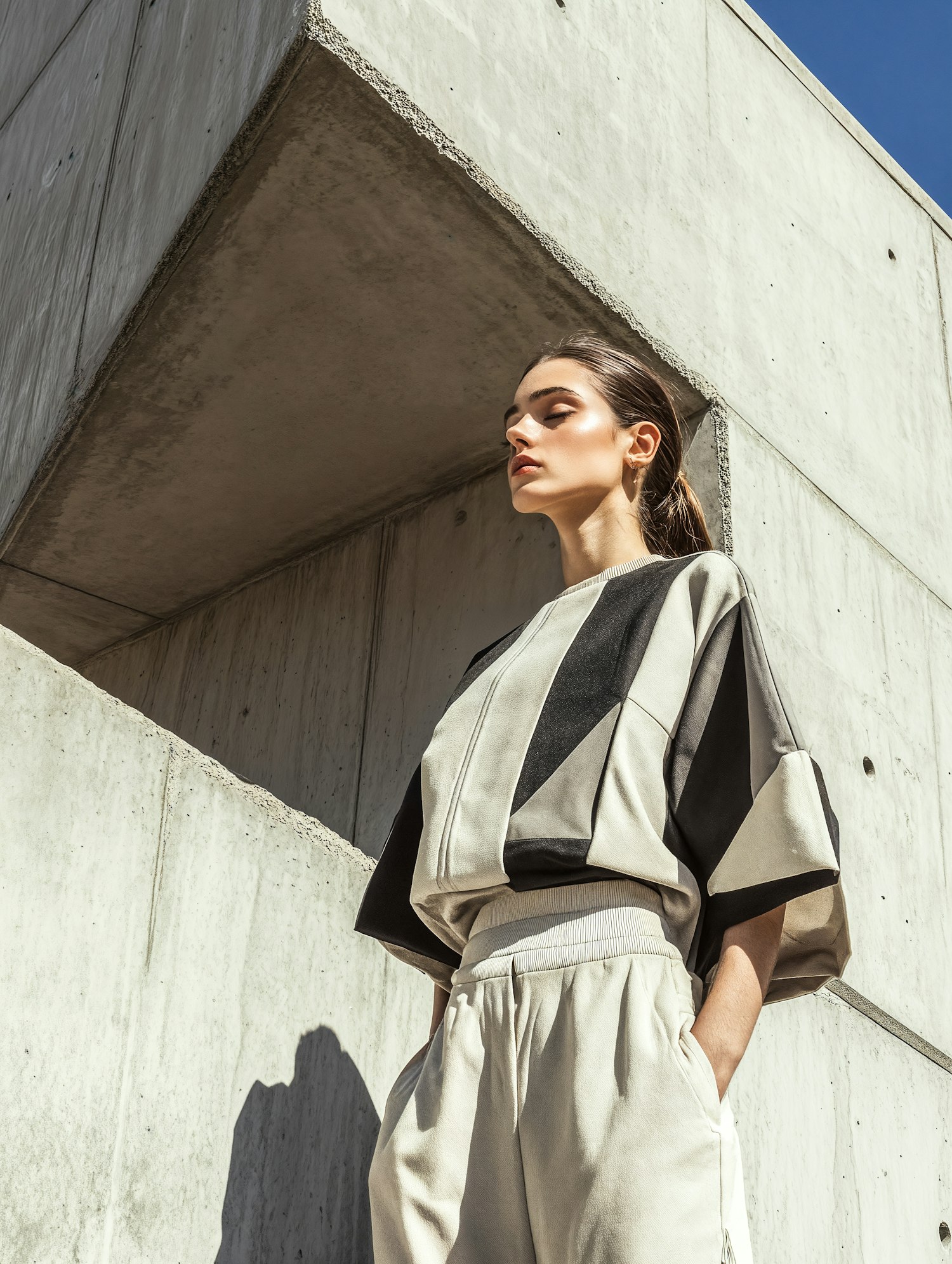 Stylish woman in geometric-patterned outfit poses against modern concrete architecture under a clear blue sky.
