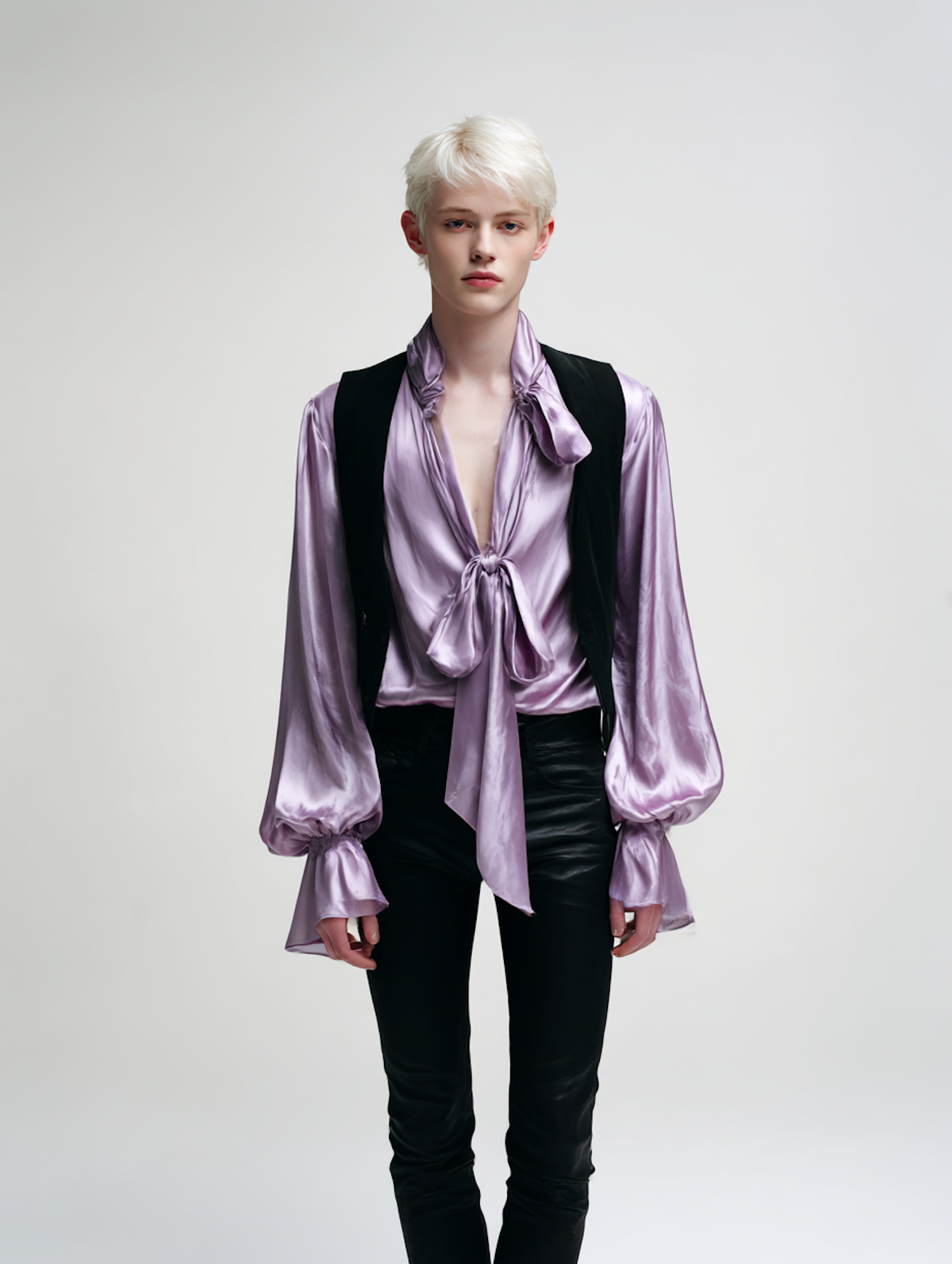 A stylish individual in a lavender blouse and black leather pants showcases a bold and modern fashion statement.