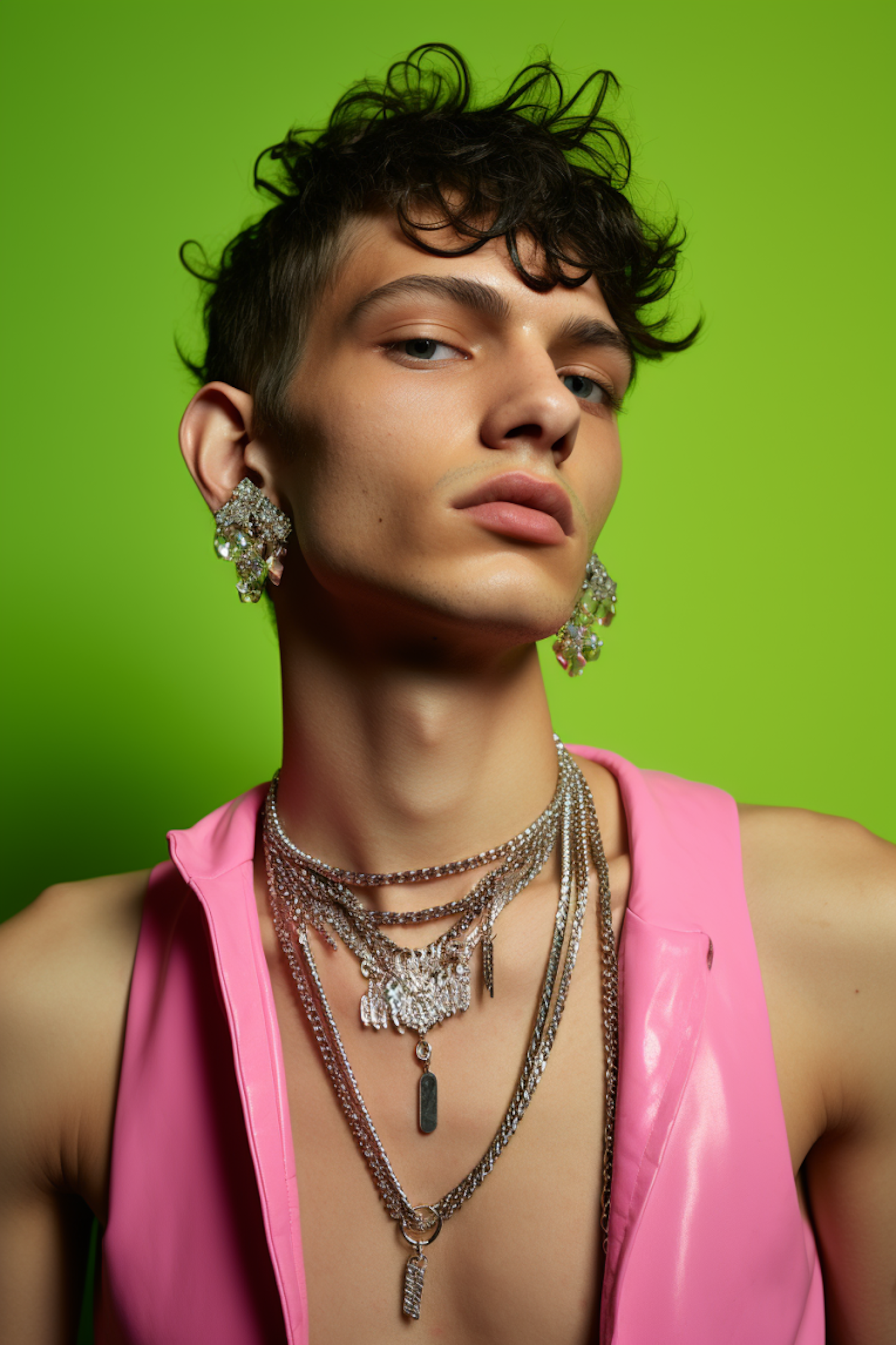 Stylish portrait of a young individual in a pink top, layered silver necklaces, and crystal earrings against a vibrant green background.