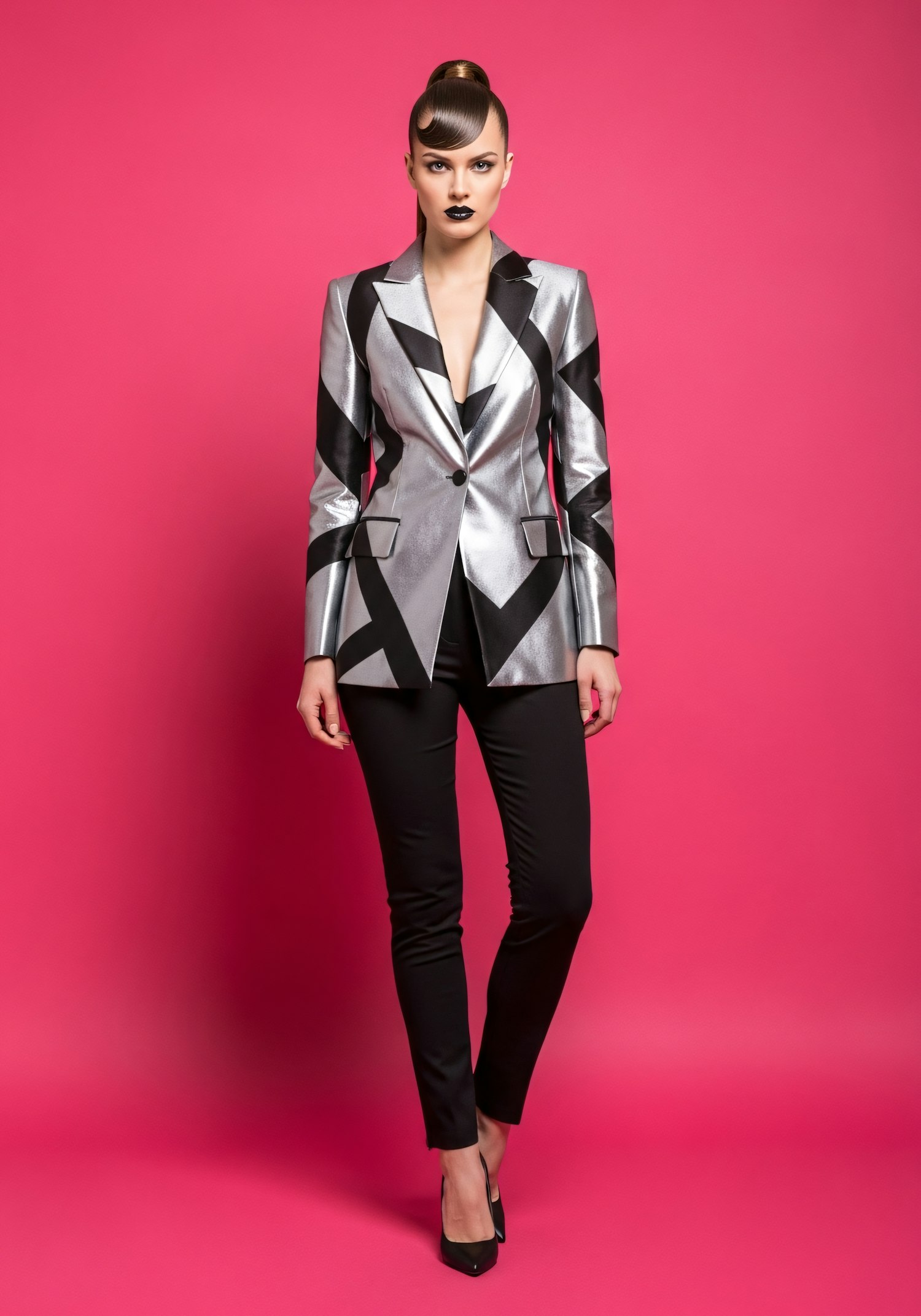 A stylish woman in a silver and black geometric blazer poses against a pink background, showcasing modern fashion and bold makeup.