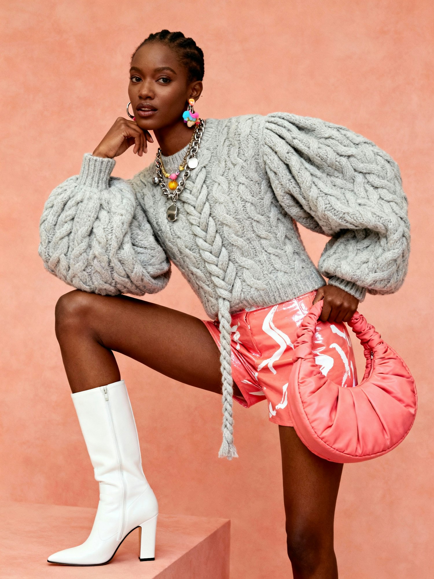 A confident woman standing against a plain soft coral background that complements her warm brown skin tone and the vibrant tones of her outfit. She wears a chunky oversized light gray cable-knit sweater with voluminous sleeves and a prominent braided pattern down the front. She pairs it with shiny coral pink shorts featuring white abstract patterns, white knee-high heeled boots, and a large round coral pink handbag with a gathered texture. Accessories include layered necklaces, chunky chain details, earrings, and a bold editorial stance. The look blends cozy maximalism, playful texture contrast, and avant-garde streetwear styling