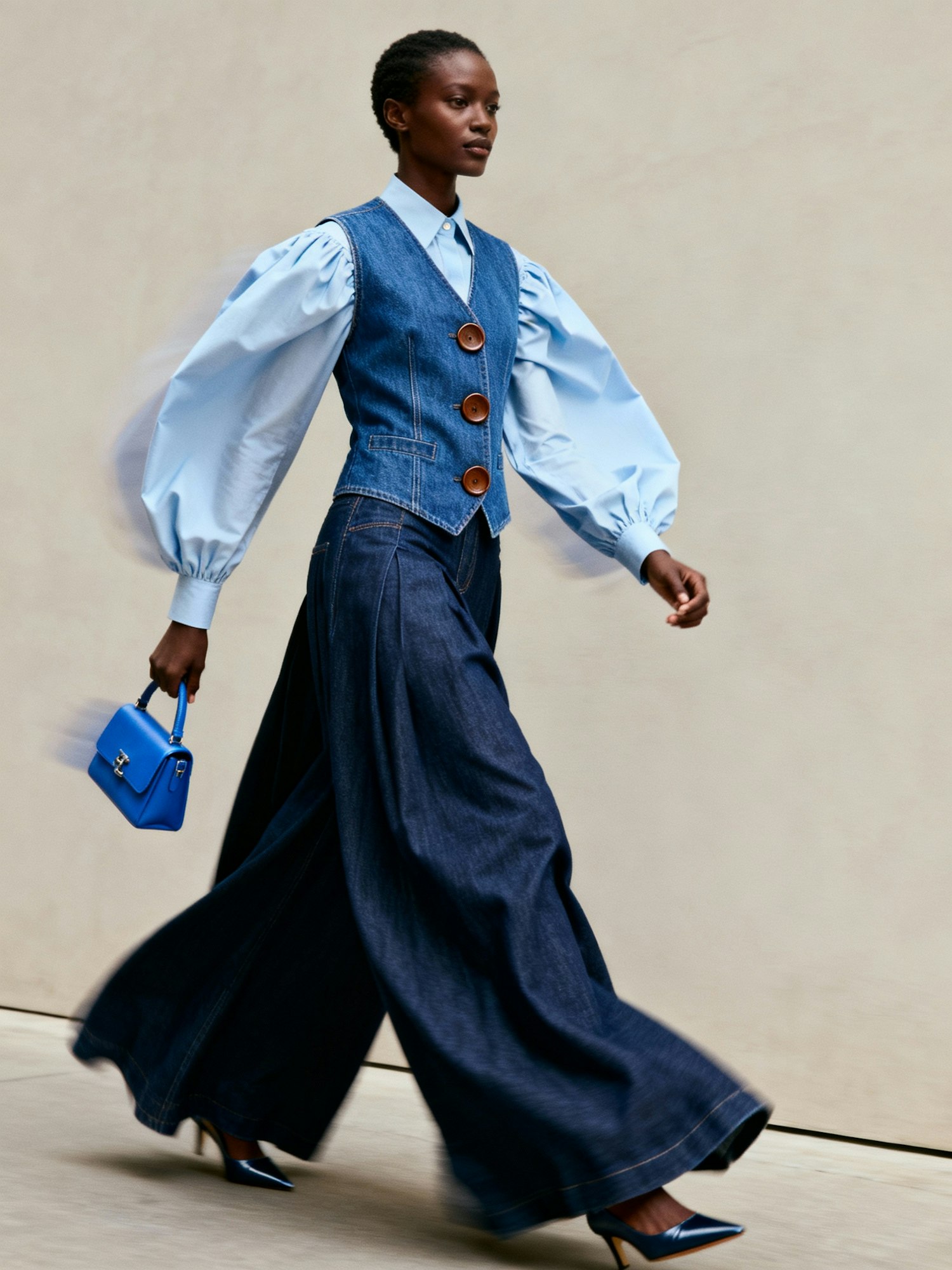 A fashionable person in a denim vest and wide-leg trousers, carrying a blue handbag, walking confidently against a neutral background.