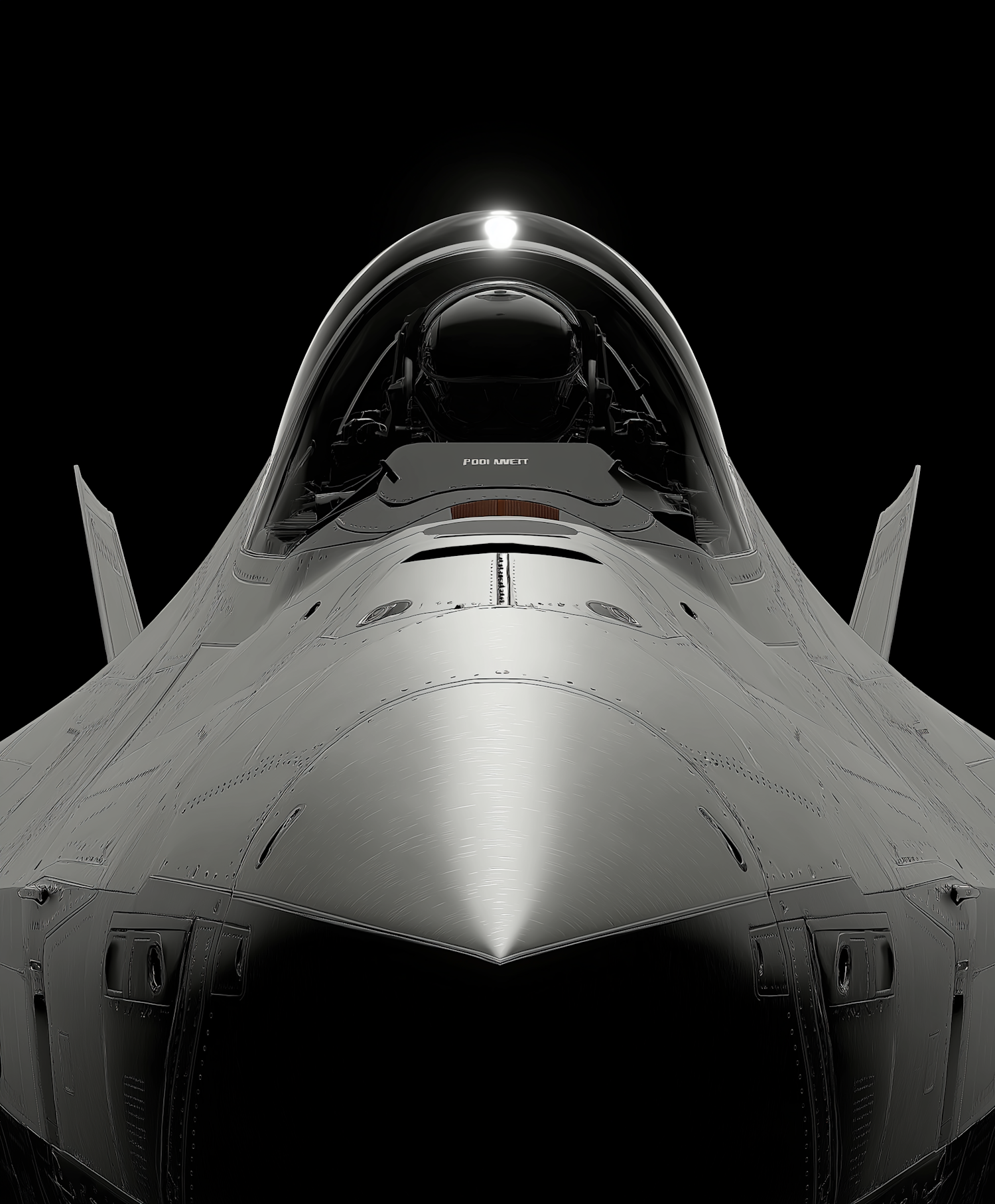 Close-up of a modern fighter jet's cockpit and nose, showcasing sleek design and intricate details against a black background.