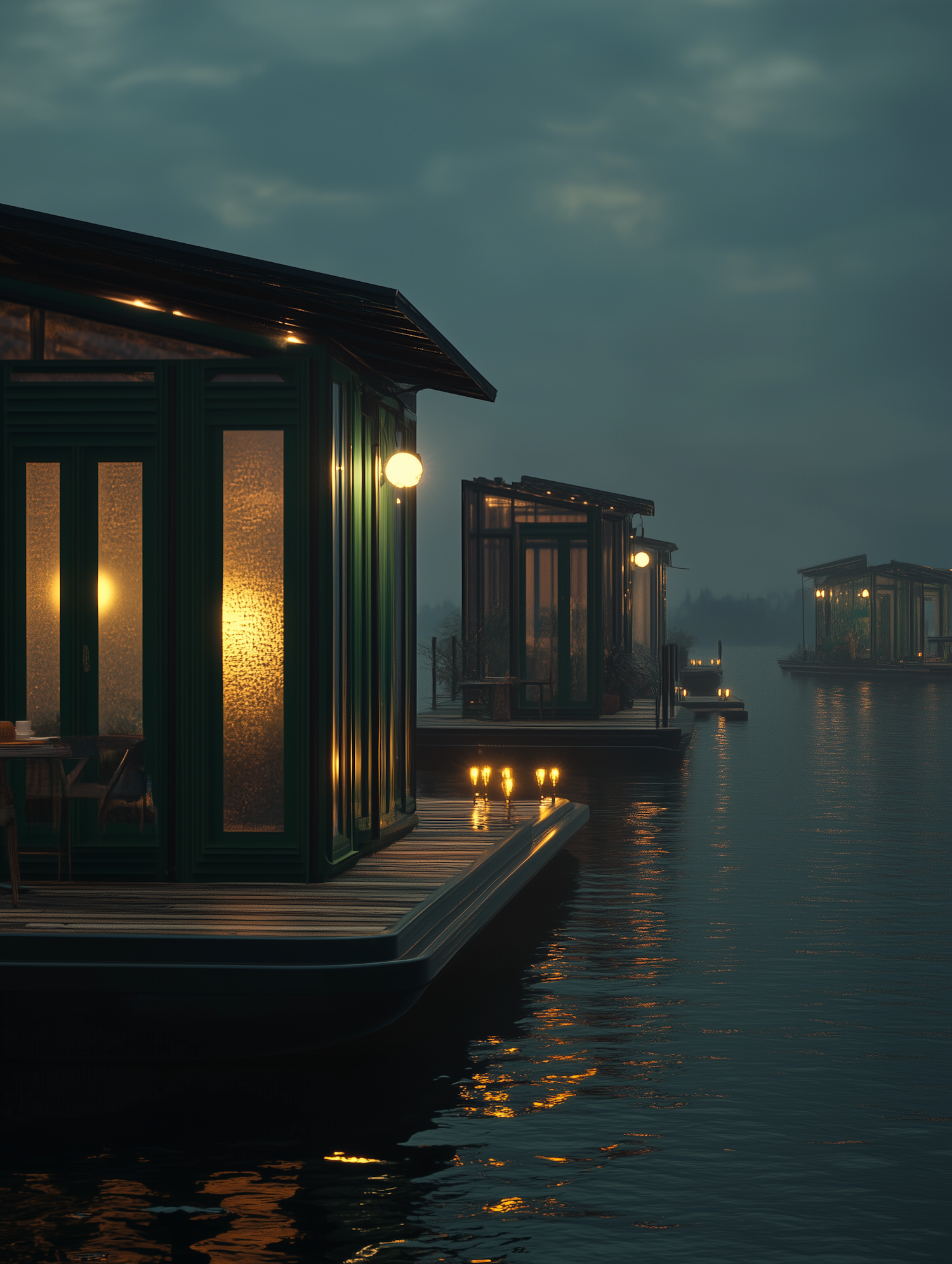 Modern floating houses with warm lights reflecting on calm water under an overcast evening sky. A tranquil and cozy waterfront scene.