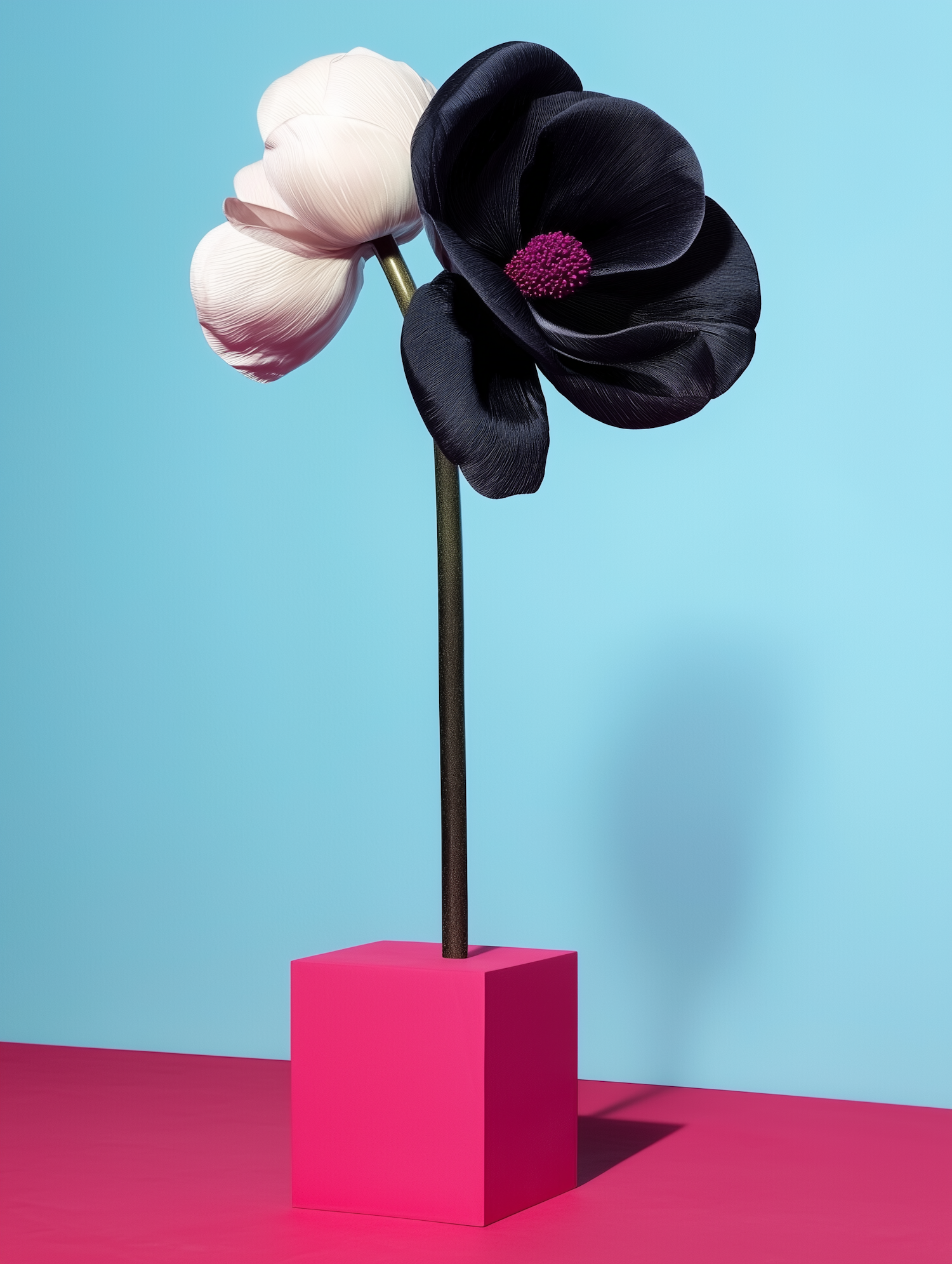 Modern floral art with bold black and white flowers on a magenta base against a cyan background. Perfect for contemporary design lovers.