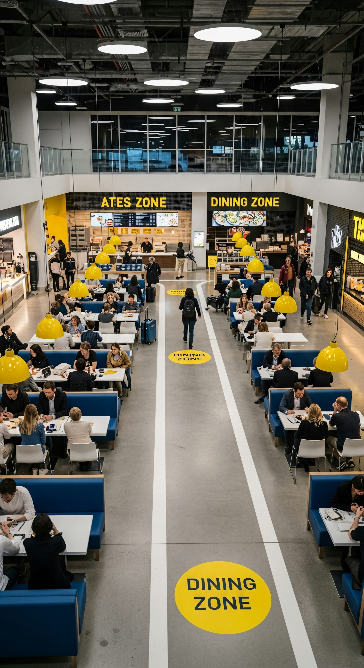 Modern food court with vibrant yellow accents, blue seating, and a lively atmosphere. People enjoy meals and conversations in a spacious setting.