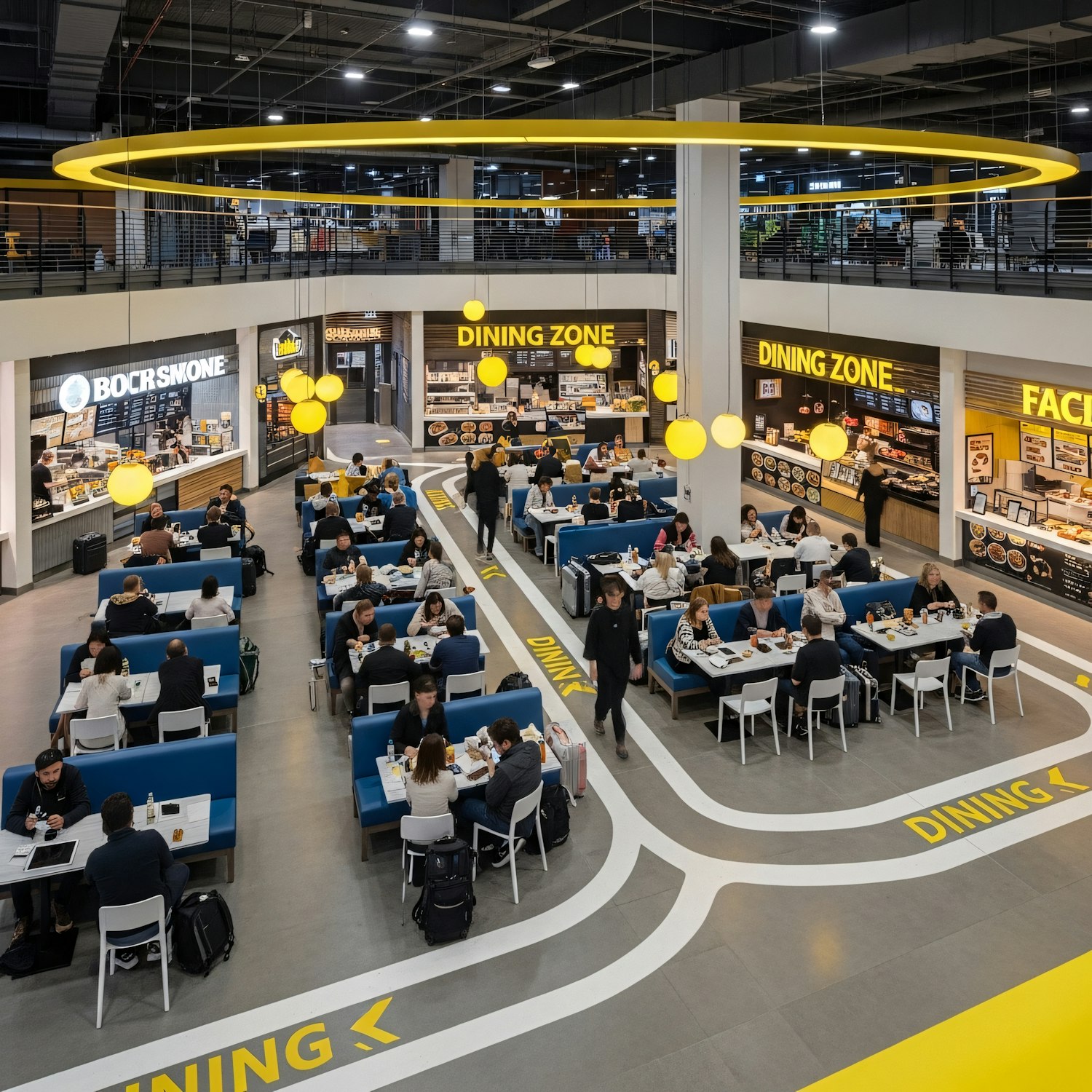 Modern food court with vibrant yellow accents, filled with diners enjoying meals at blue and white seating, surrounded by diverse food stalls.
