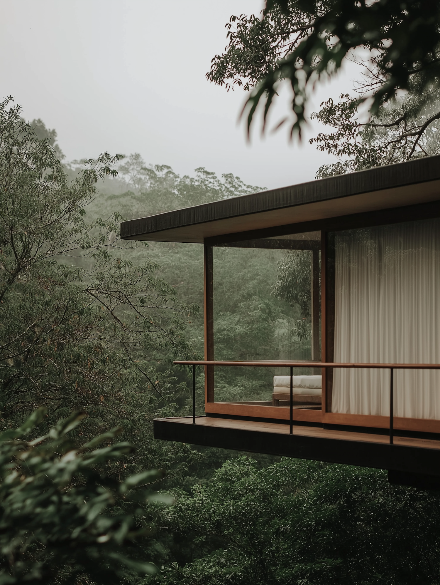 Modern glass-walled home with a cantilevered balcony surrounded by lush greenery and misty forest views.