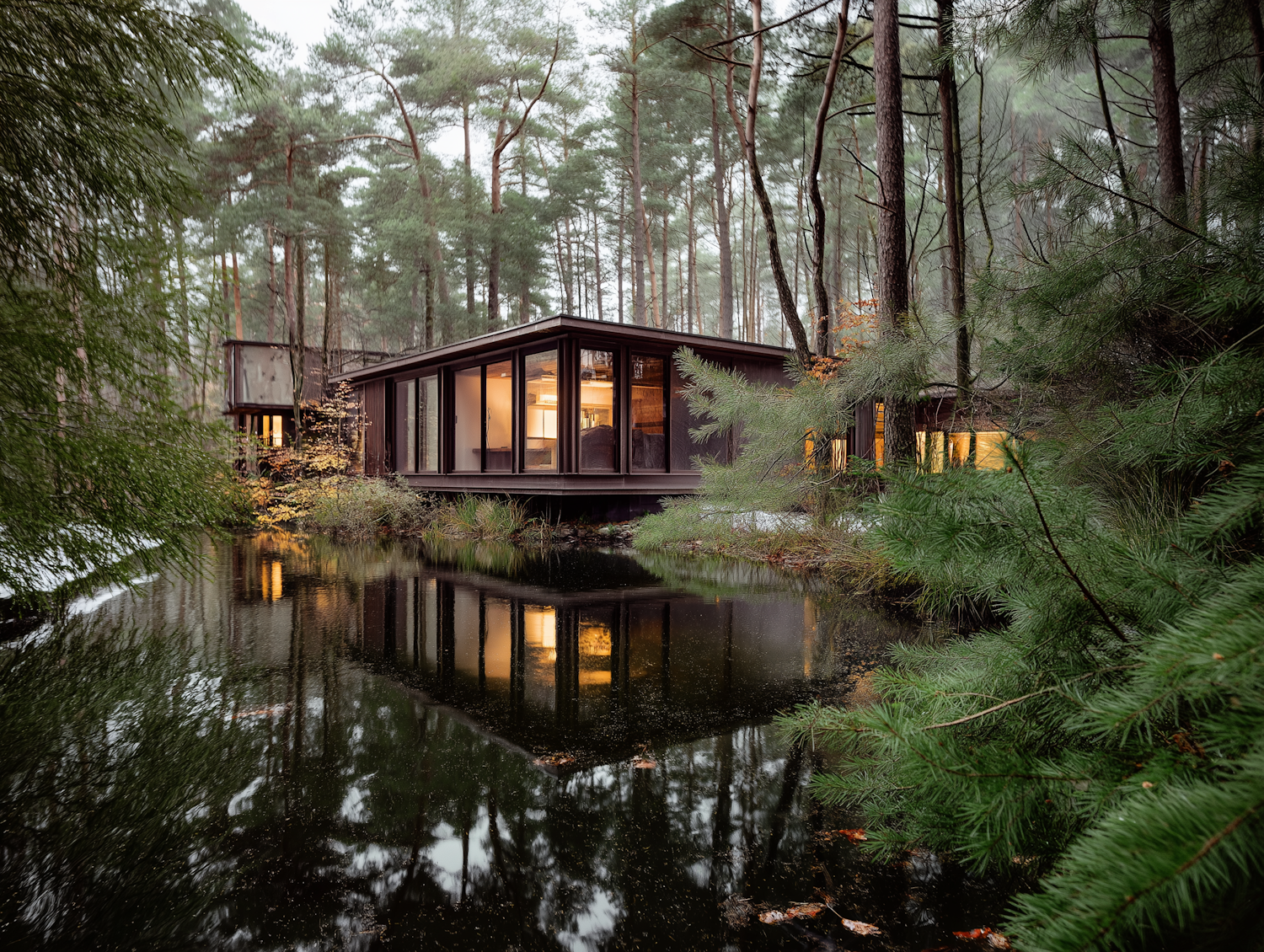 Modern glass house on stilts over a tranquil pond in a misty forest, blending seamlessly with lush greenery and serene reflections.