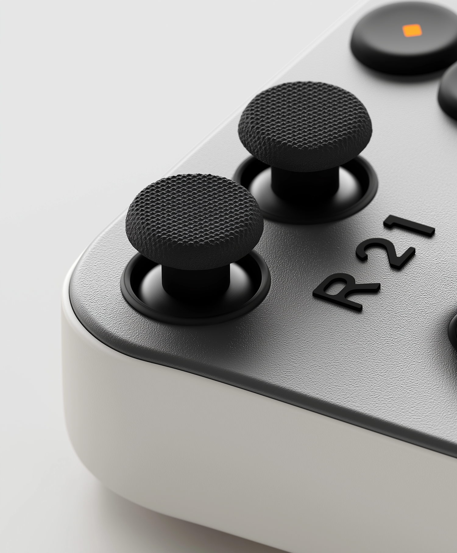 Close-up of a sleek gaming controller with textured joysticks, "R21" branding, and a modern white and gray design.