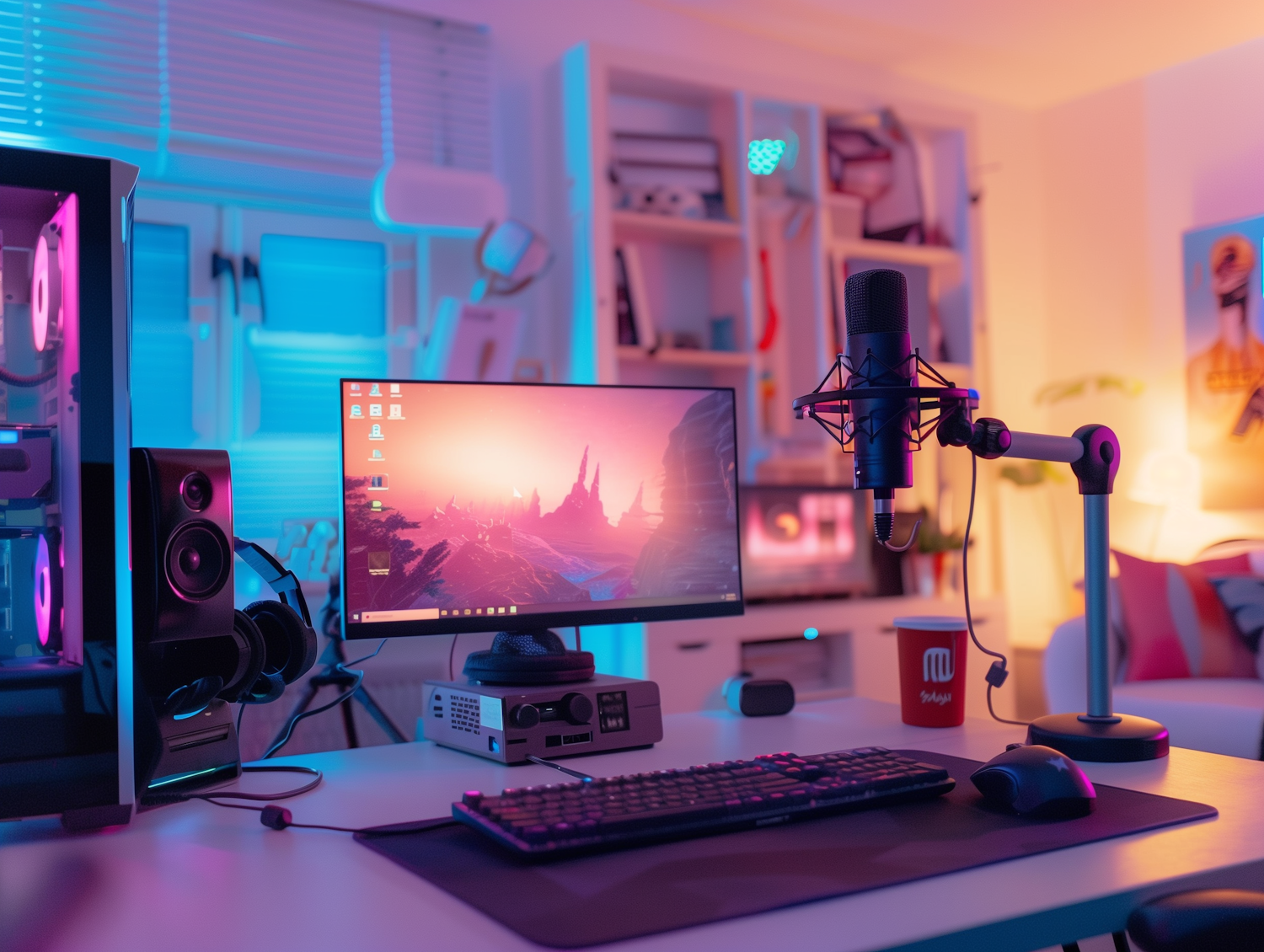 Modern gaming and streaming setup with RGB-lit PC, widescreen monitor, pro microphone, and ambient lighting in a cozy room.