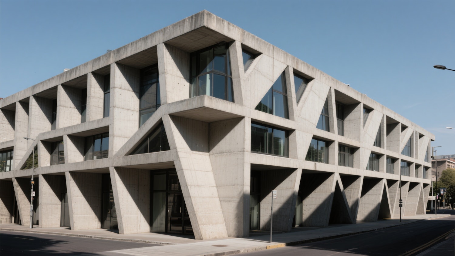 Modern concrete building with geometric facade and large windows, located on a quiet street corner under a clear blue sky.