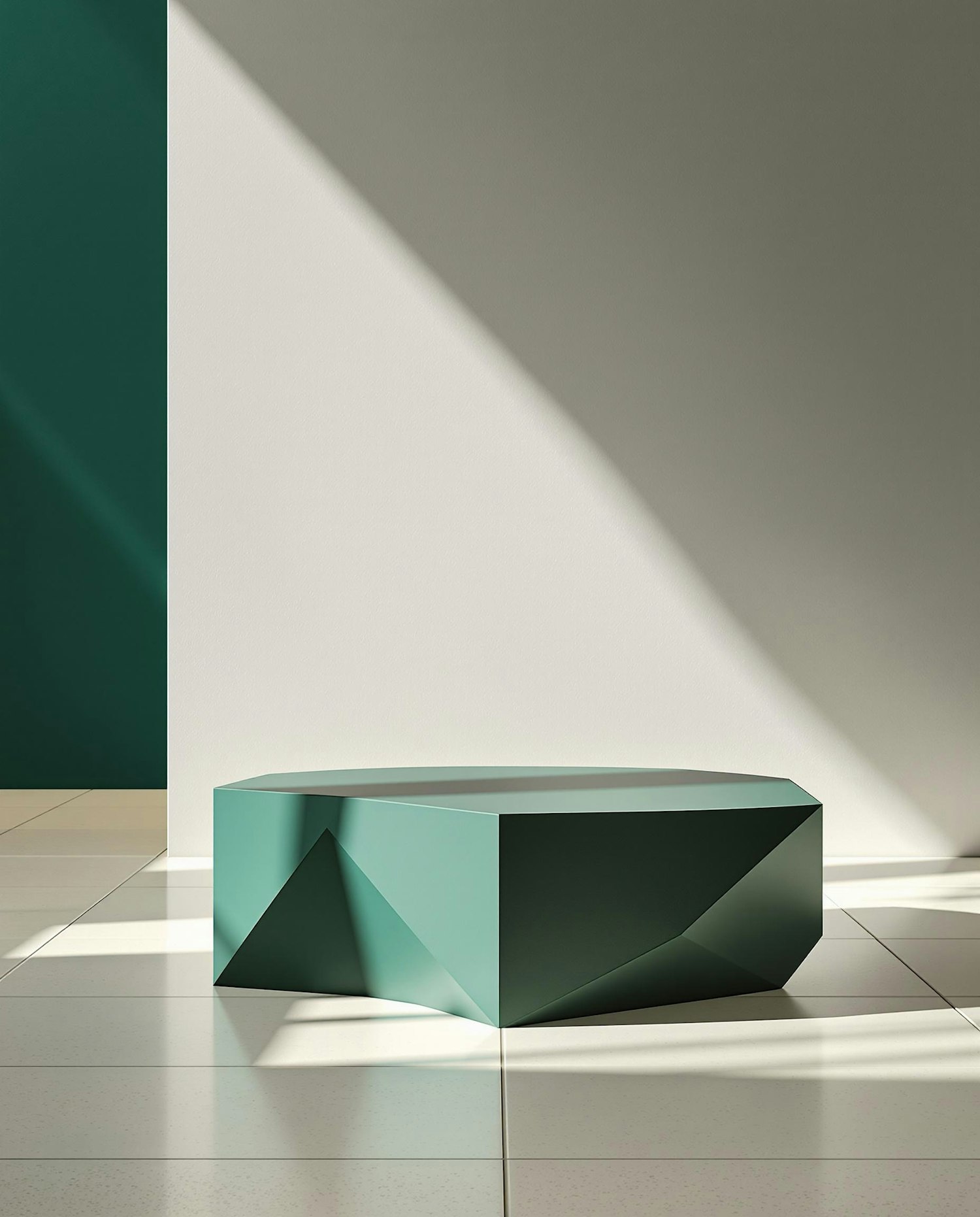 Minimalist green geometric table on a tiled floor, with sunlight casting shadows against a two-tone green and white wall.