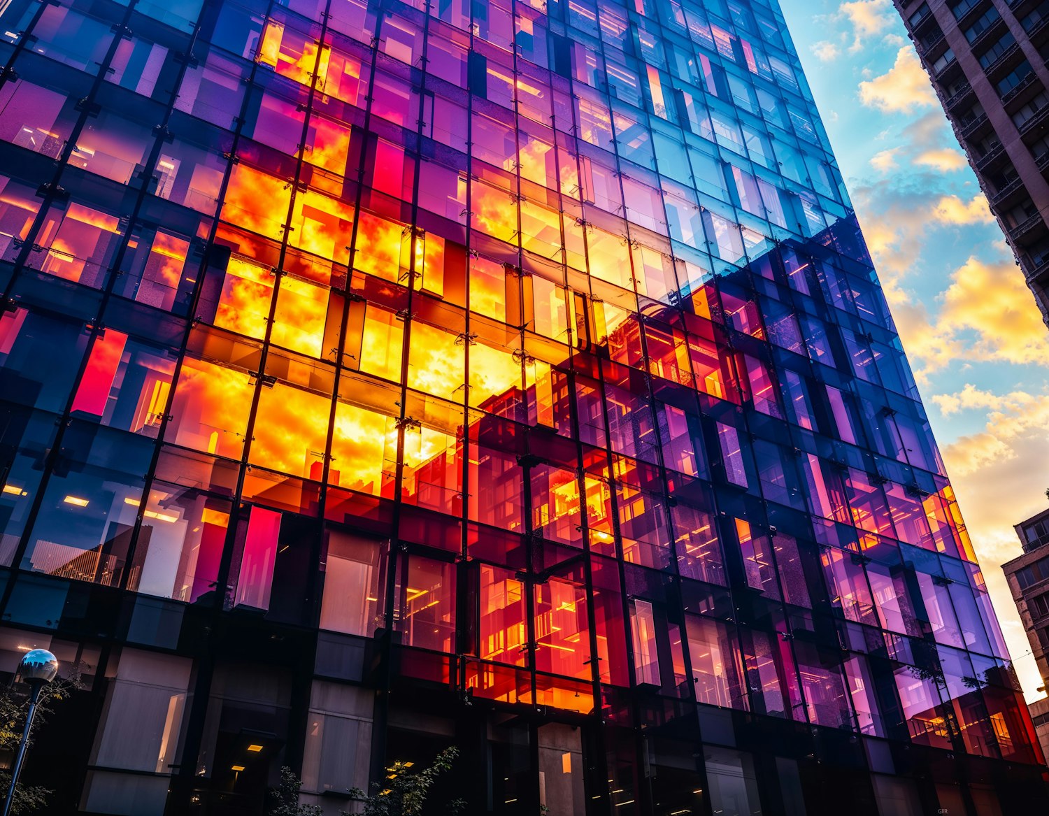 Vibrant sunset reflection on a modern glass building, creating a fiery visual effect with deep oranges and purples.