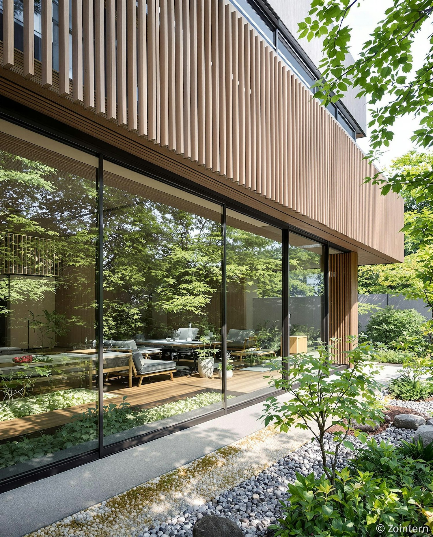 Modern home with floor-to-ceiling windows, wooden slats, and a lush garden with a pebble pathway. Perfect blend of nature and architecture.