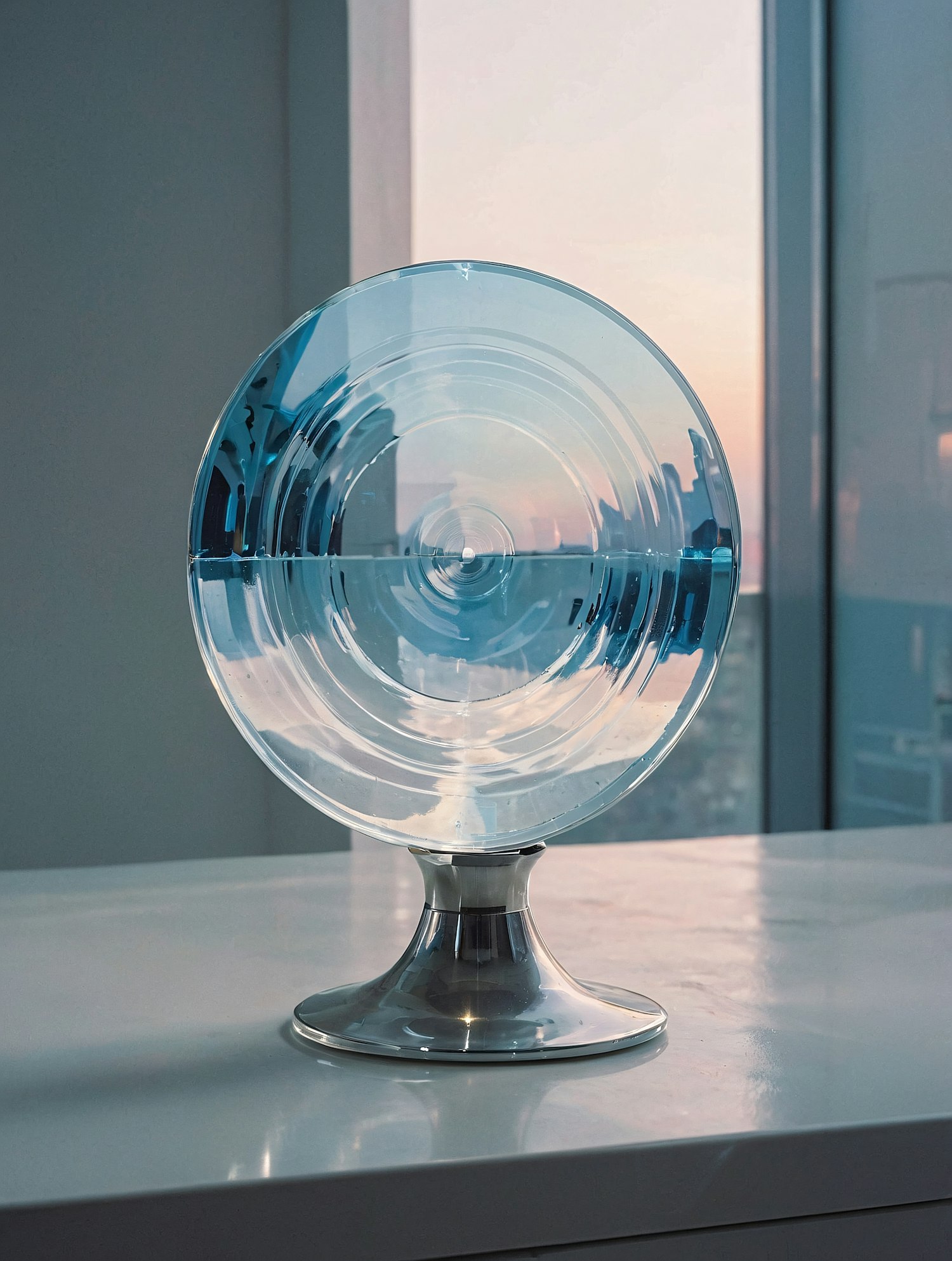 A circular blue glass decor piece with ripples on a metallic base, set against a sunset view through a large window.