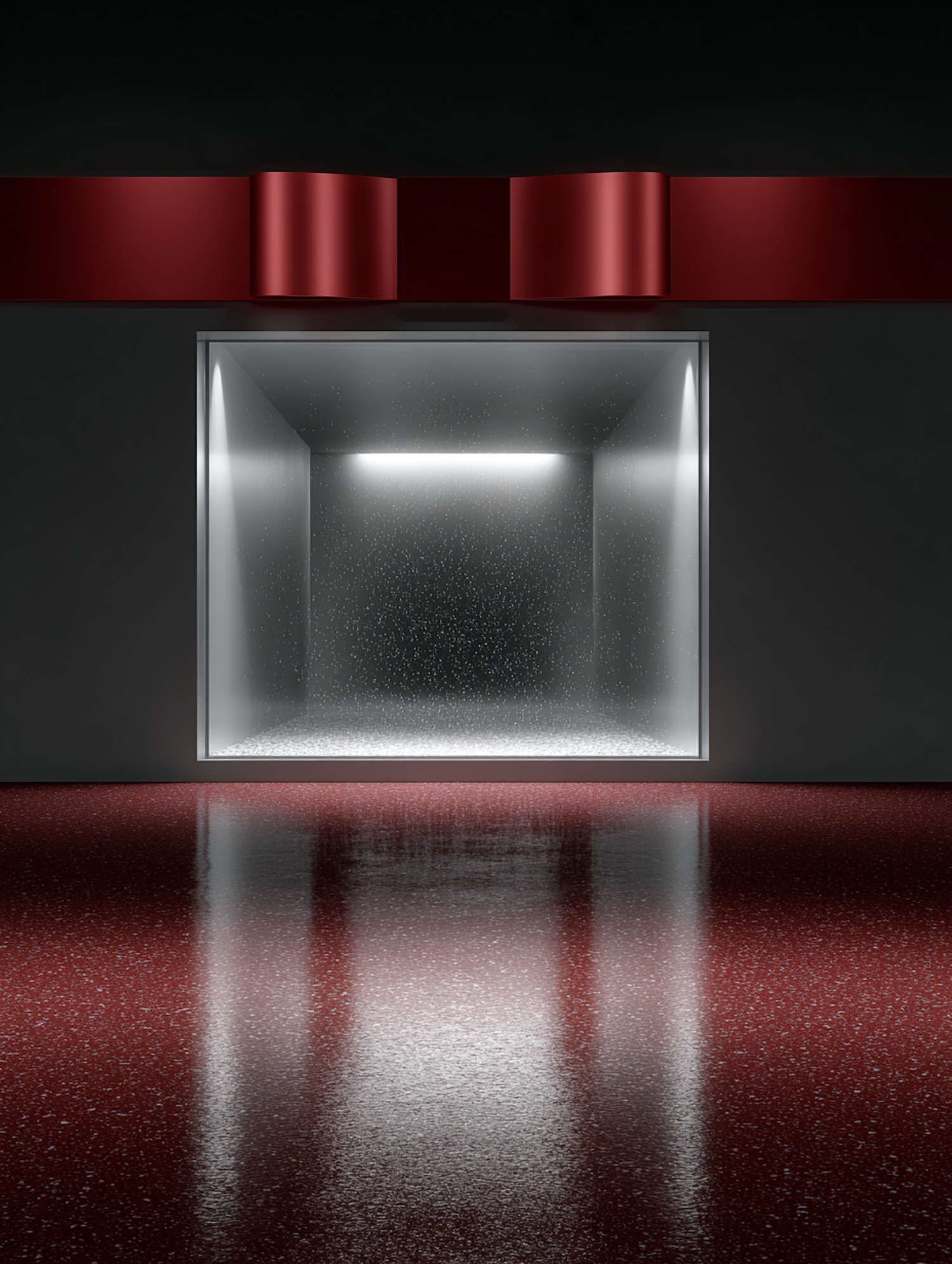 A sleek, modern scene with a glowing glass cube, a red metallic ribbon, and a glossy red floor reflecting the light.