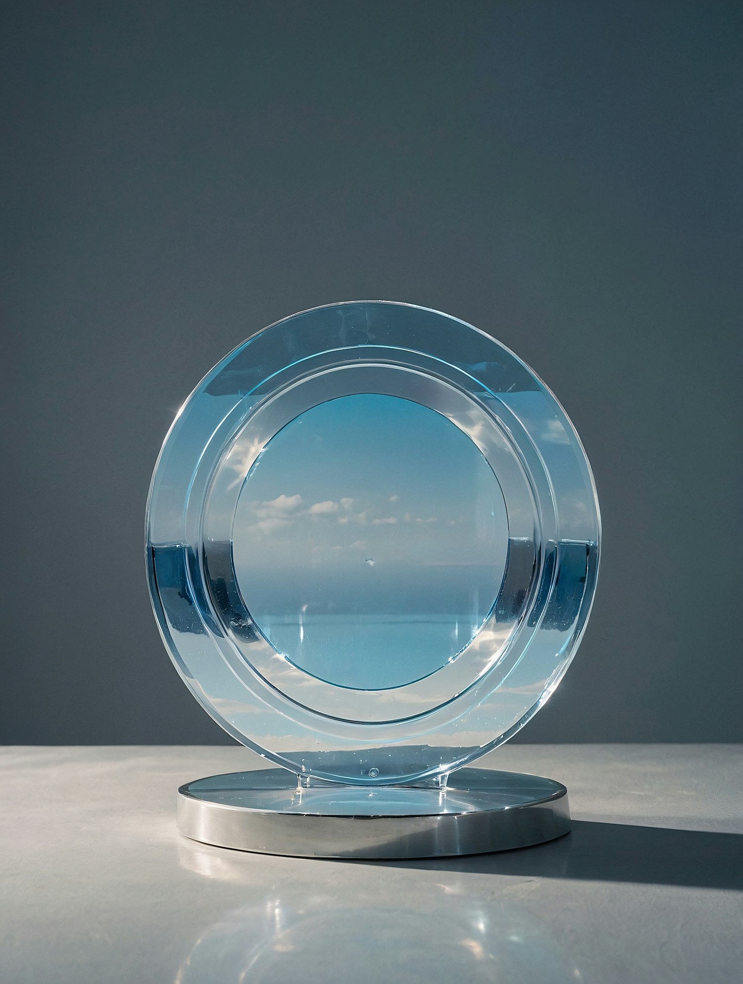 A sleek circular glass sculpture on a metallic base, reflecting light and a faint sky image, set against a soft blue-gray background.