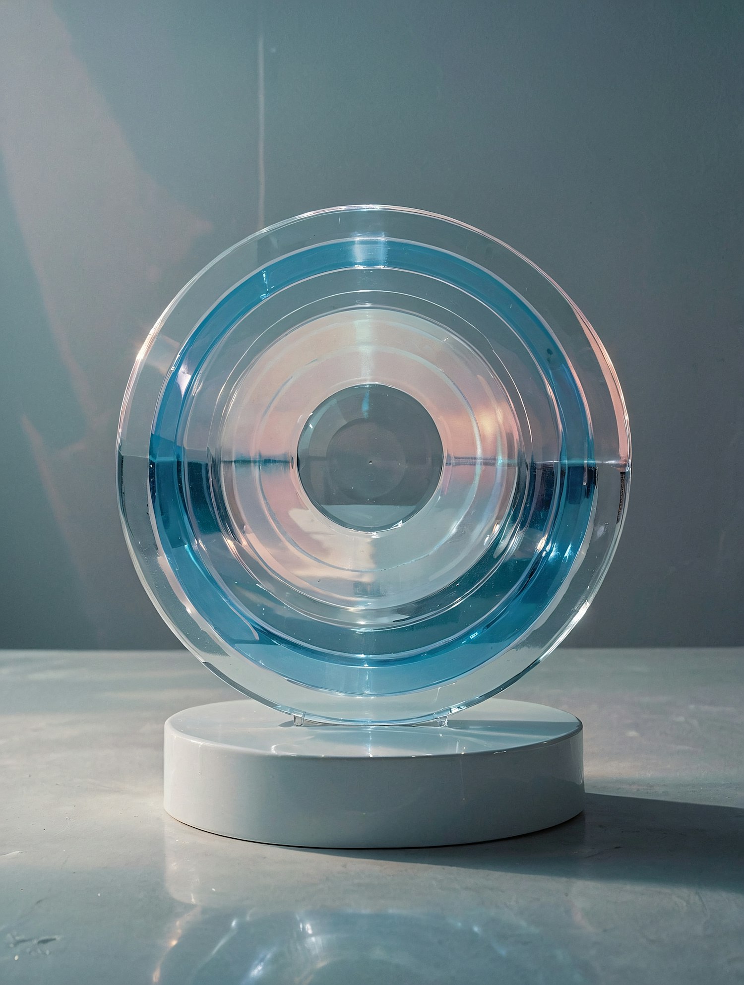 A sleek circular glass sculpture with blue gradients on a white base, set against a muted gray background for a modern, minimalist vibe.