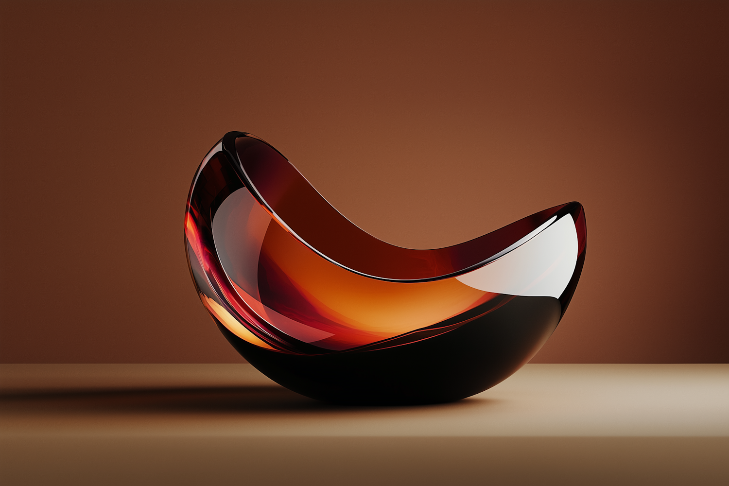 Elegant glass sculpture with amber and red hues on a neutral background, showcasing modern design and glossy finish.