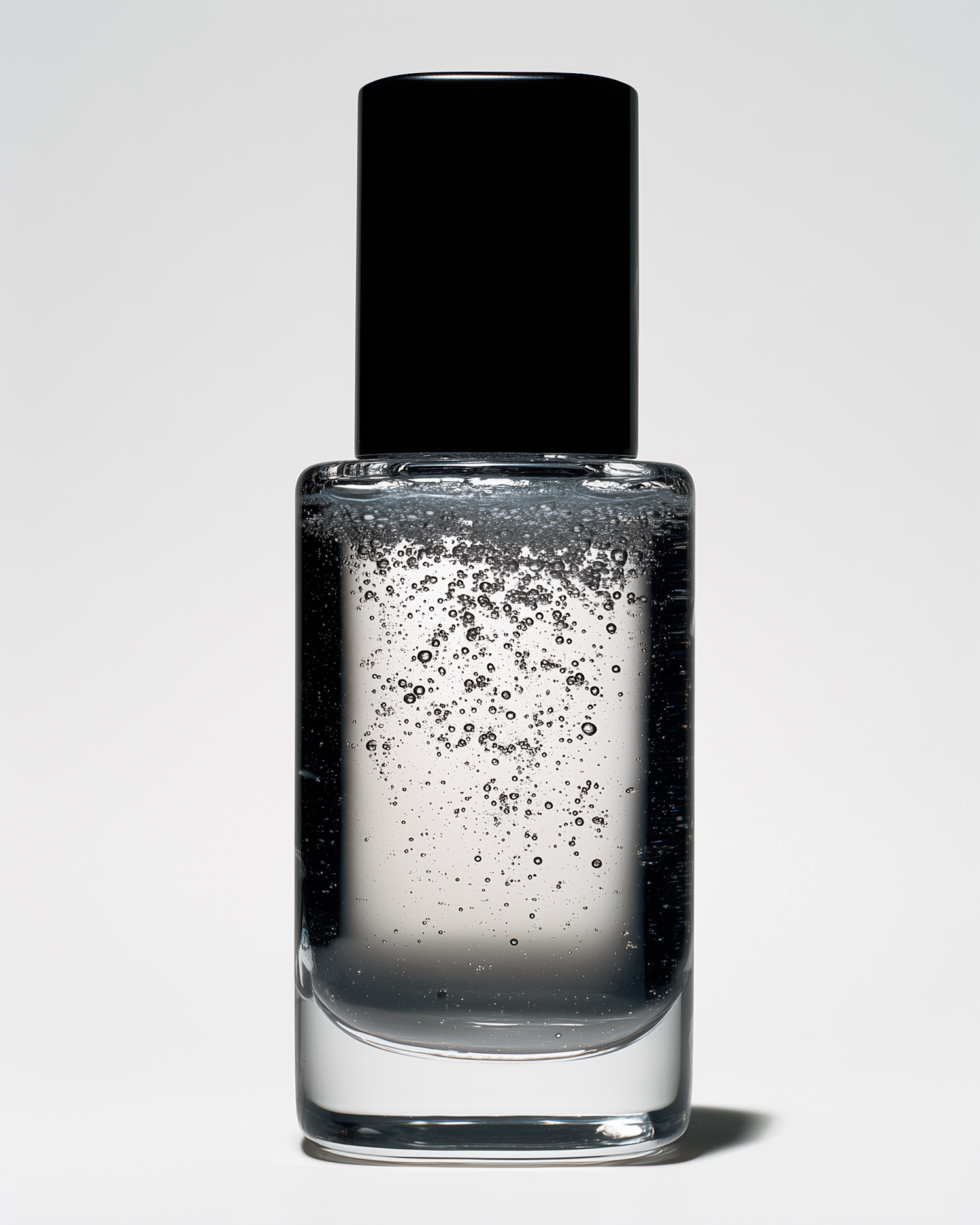 Minimalist glass bottle with black cap, filled with clear liquid and air bubbles, perfect for skincare or cosmetic product visuals.