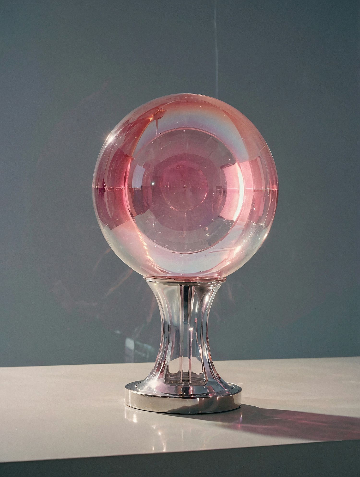 A stunning pink glass sphere on a sleek metallic pedestal, reflecting light beautifully in a minimalist setting.