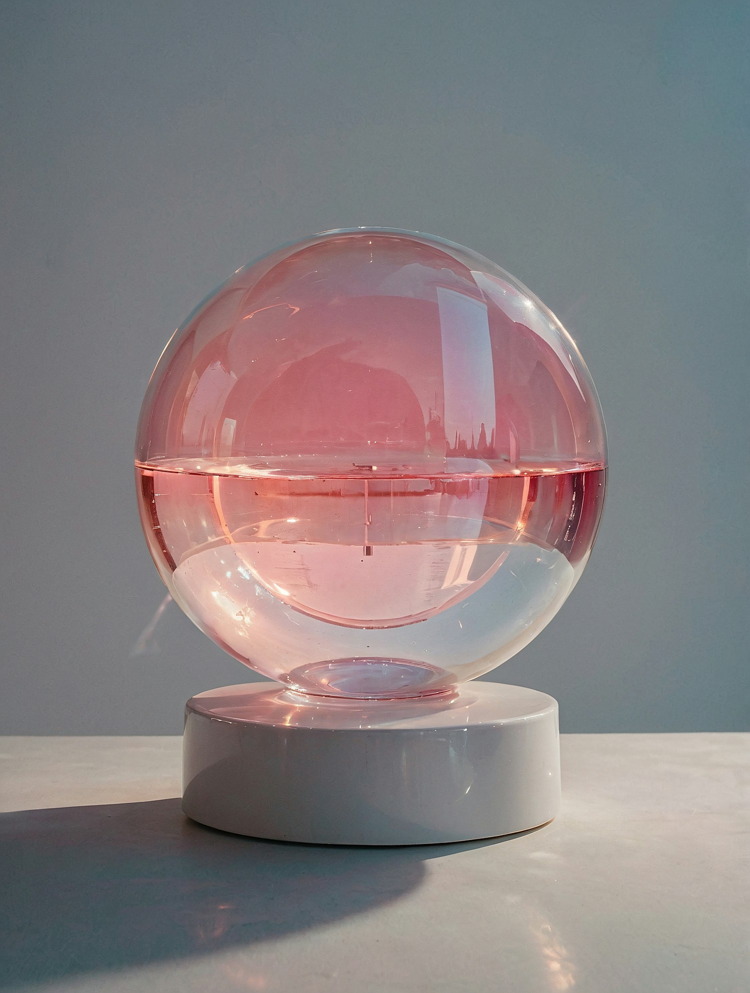 A sleek glass sphere with a pink tint on a white base, reflecting light beautifully in a minimalist setting. Perfect for modern decor.