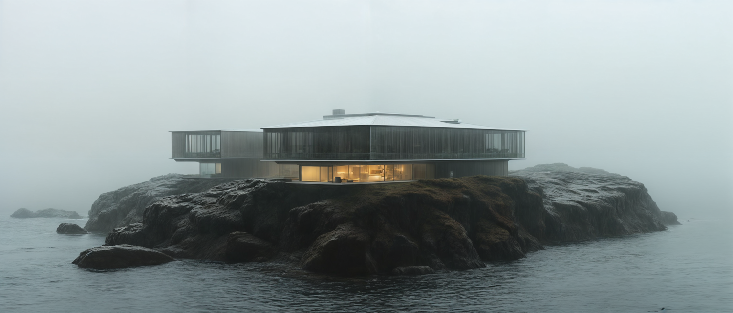 Modern glass house on a rocky island in a misty seascape, blending minimalist design with natural surroundings.