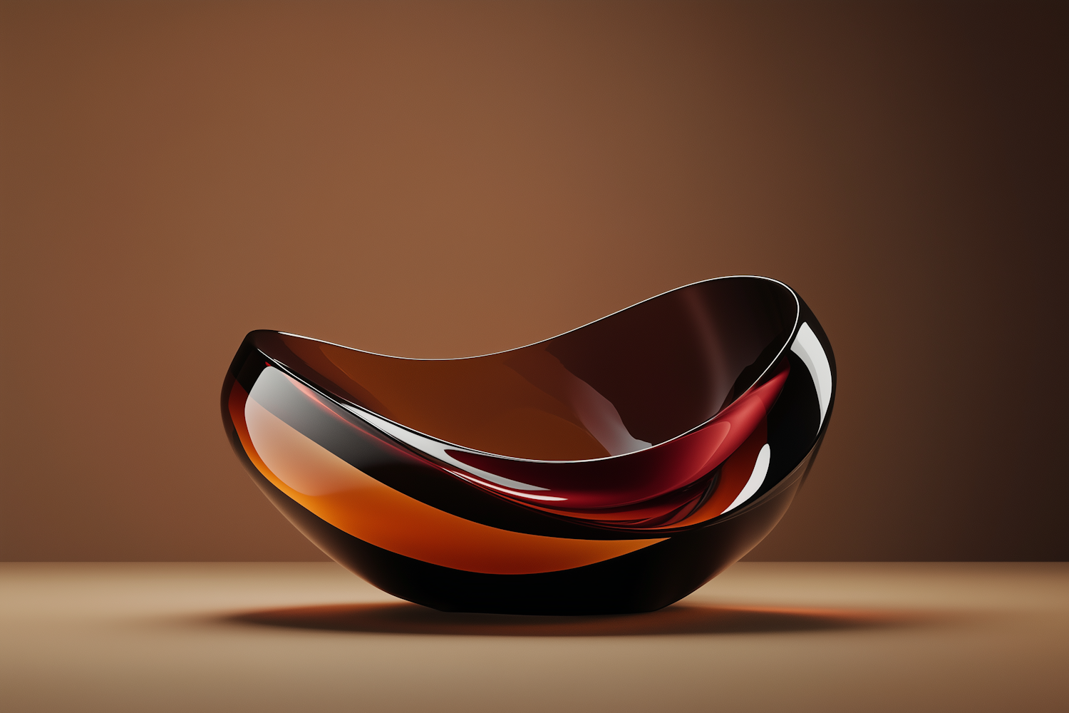 Elegant glass bowl with a glossy finish and rich gradient colors, set against a warm brown background. Modern and artistic design.