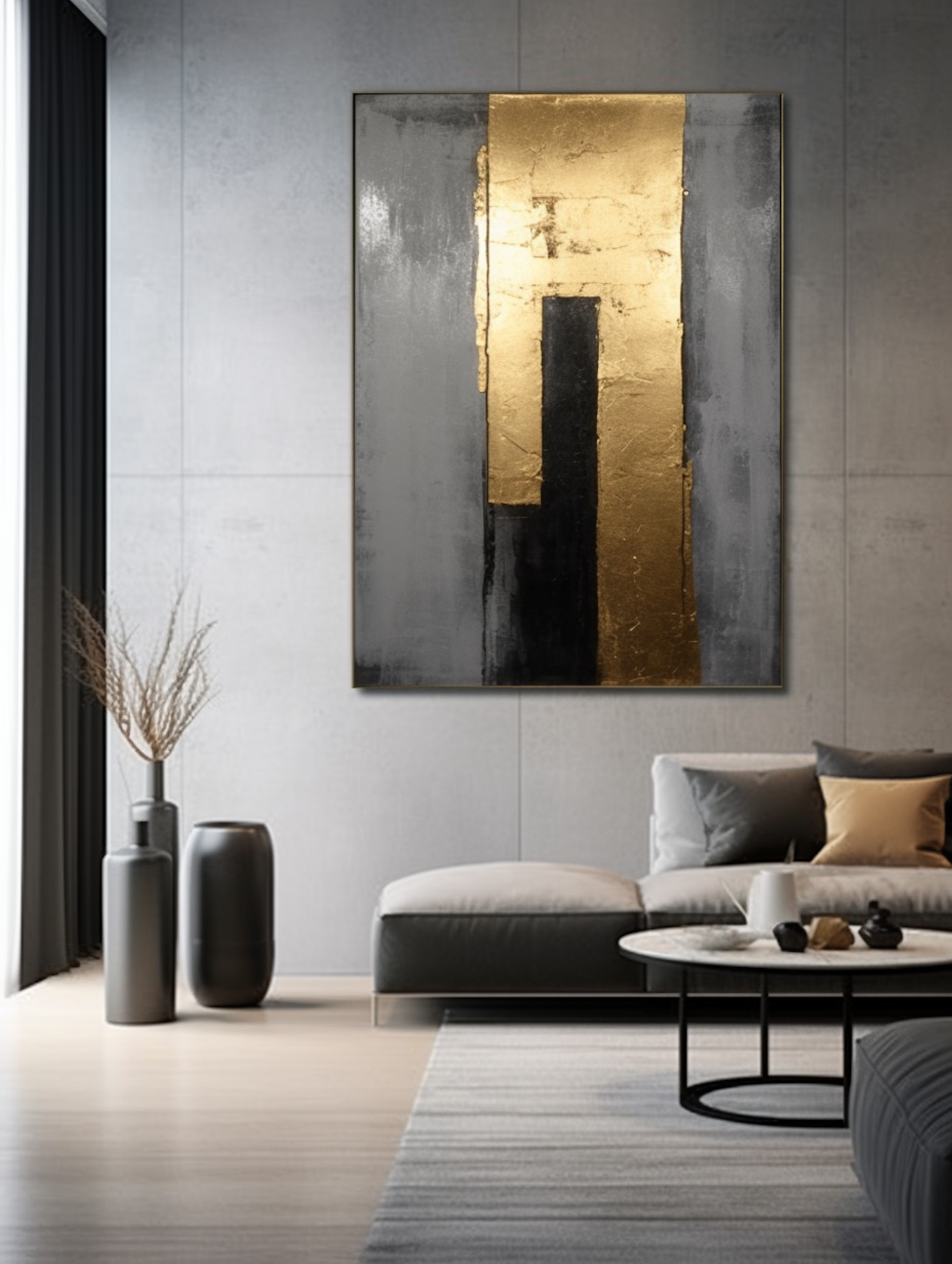 Modern living room with abstract gold and black painting, gray sofa, minimalist decor, and natural light.