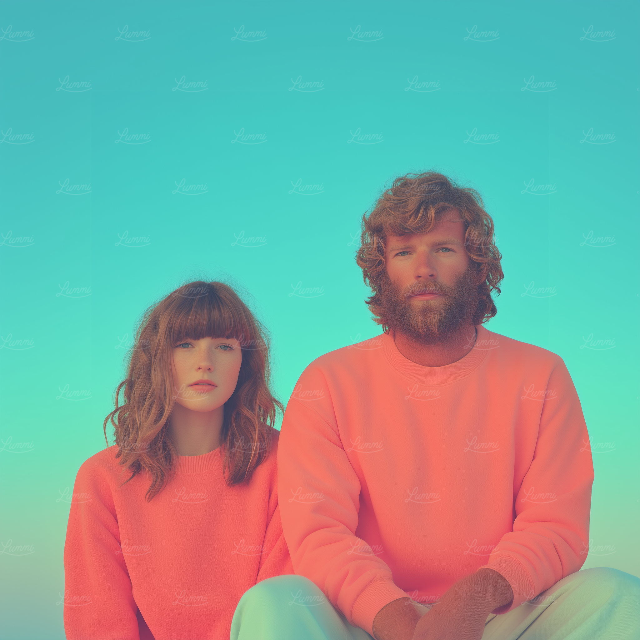 A man and woman in matching coral sweatshirts sit against a turquoise gradient background, creating a bold and modern aesthetic.