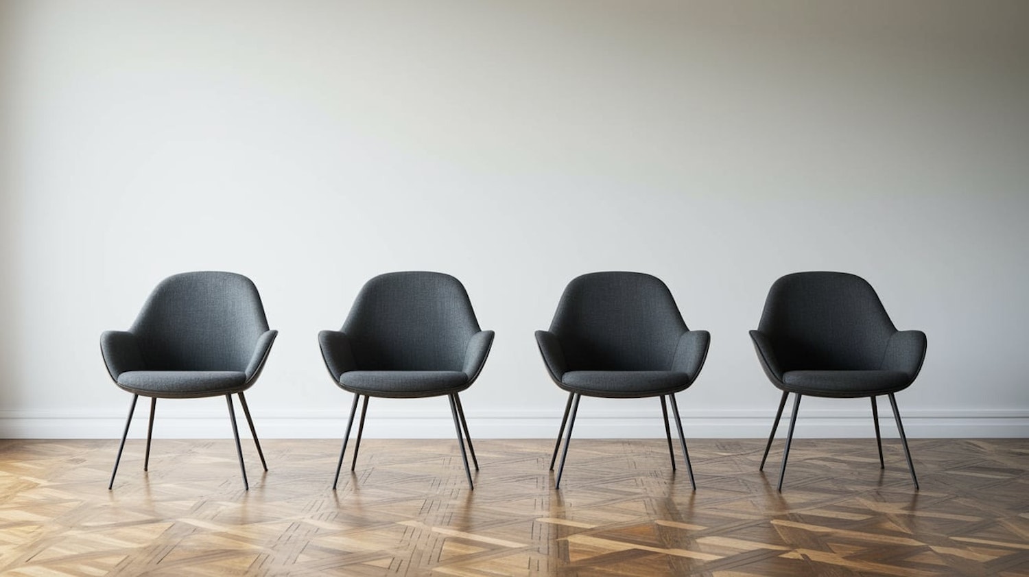 Four sleek gray chairs with armrests on a polished wooden floor, set against a minimalist white wall. Perfect for modern interiors.