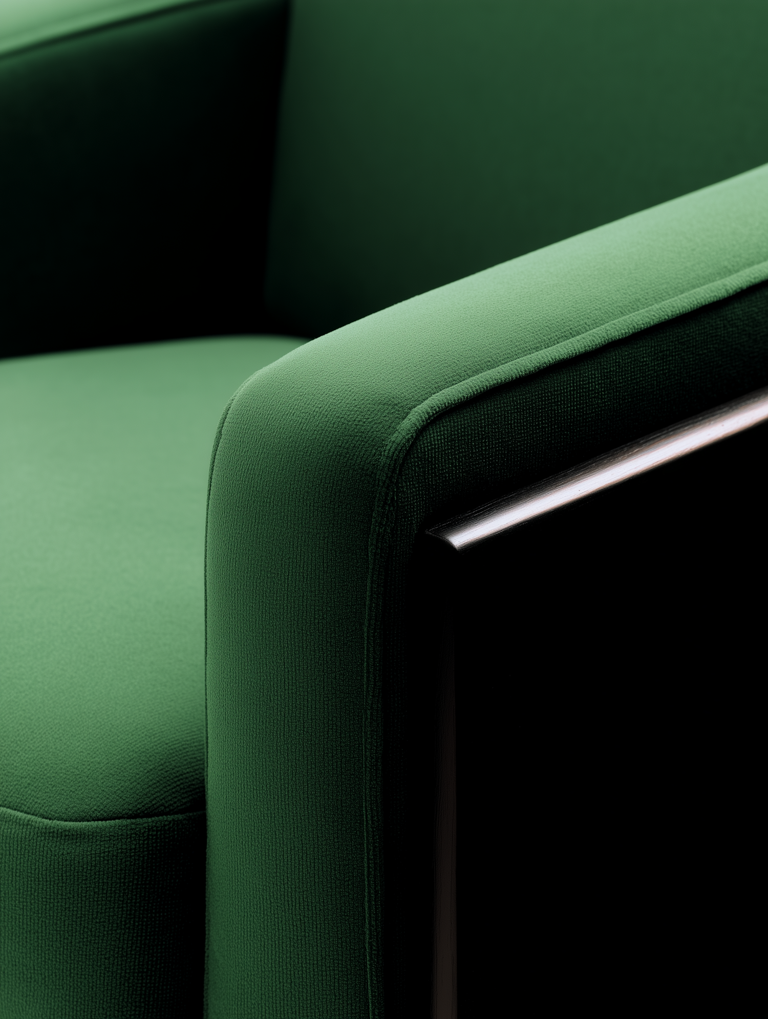 Close-up of a green armchair with textured fabric, sleek metallic accents, and a minimalist design against a dark background.