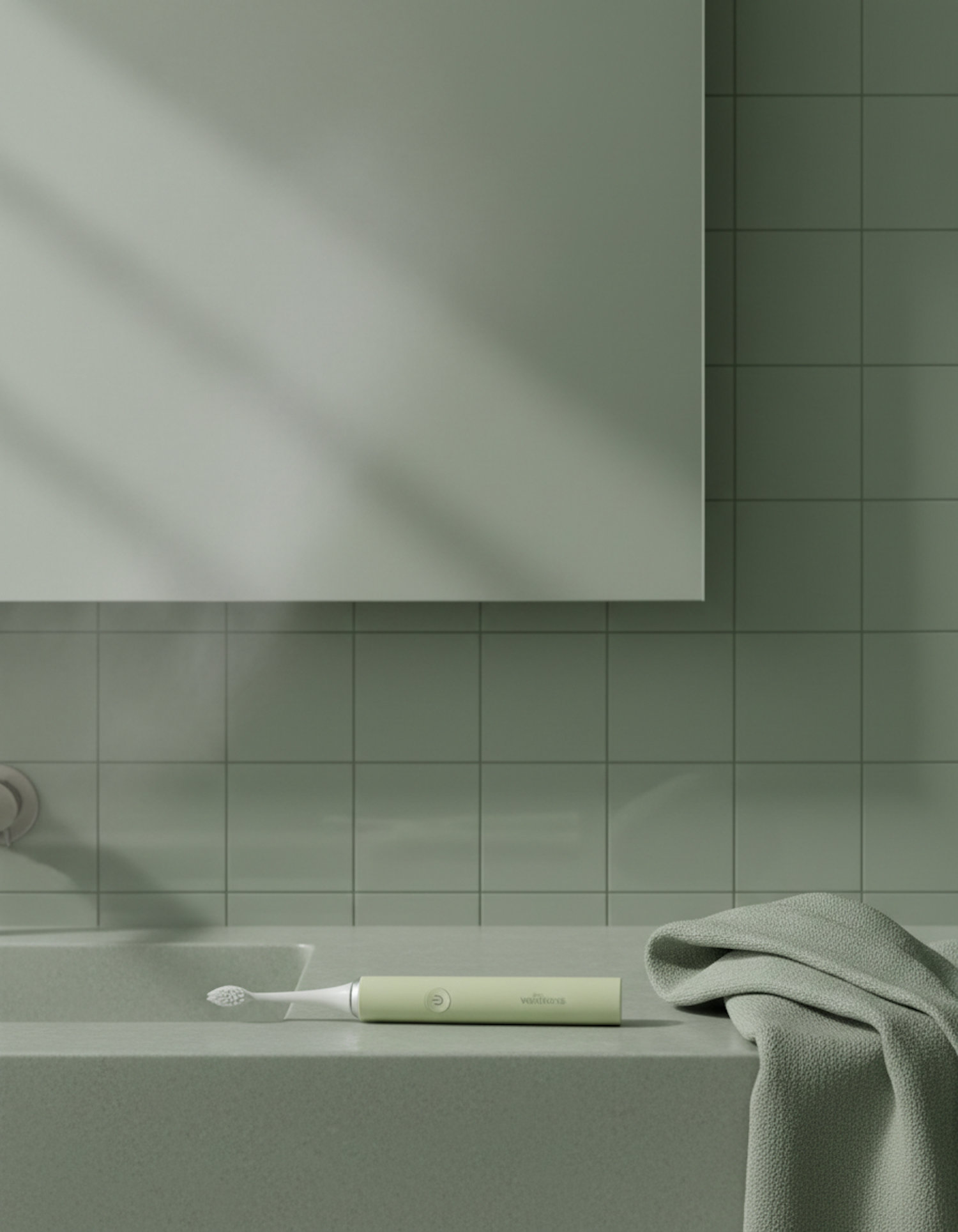 A sleek green electric toothbrush on a matching countertop with a towel, set against a tiled green bathroom wall.