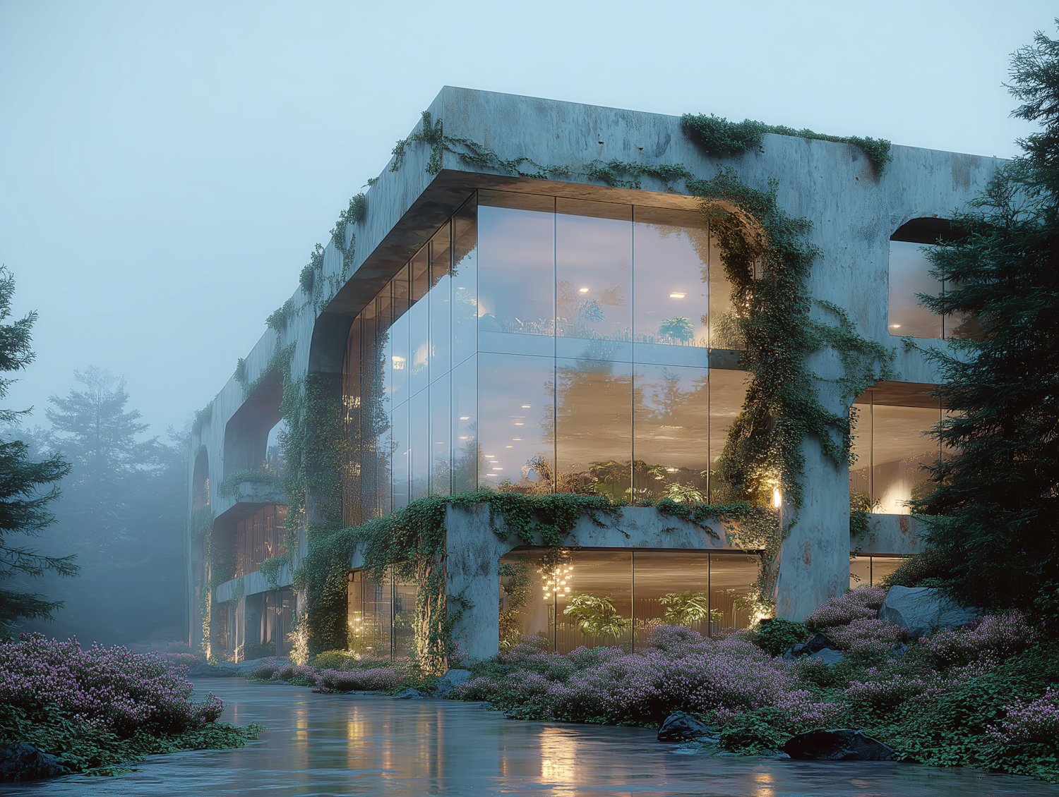 Modern glass building with lush greenery and misty surroundings, blending architecture with nature for a serene and tranquil vibe.