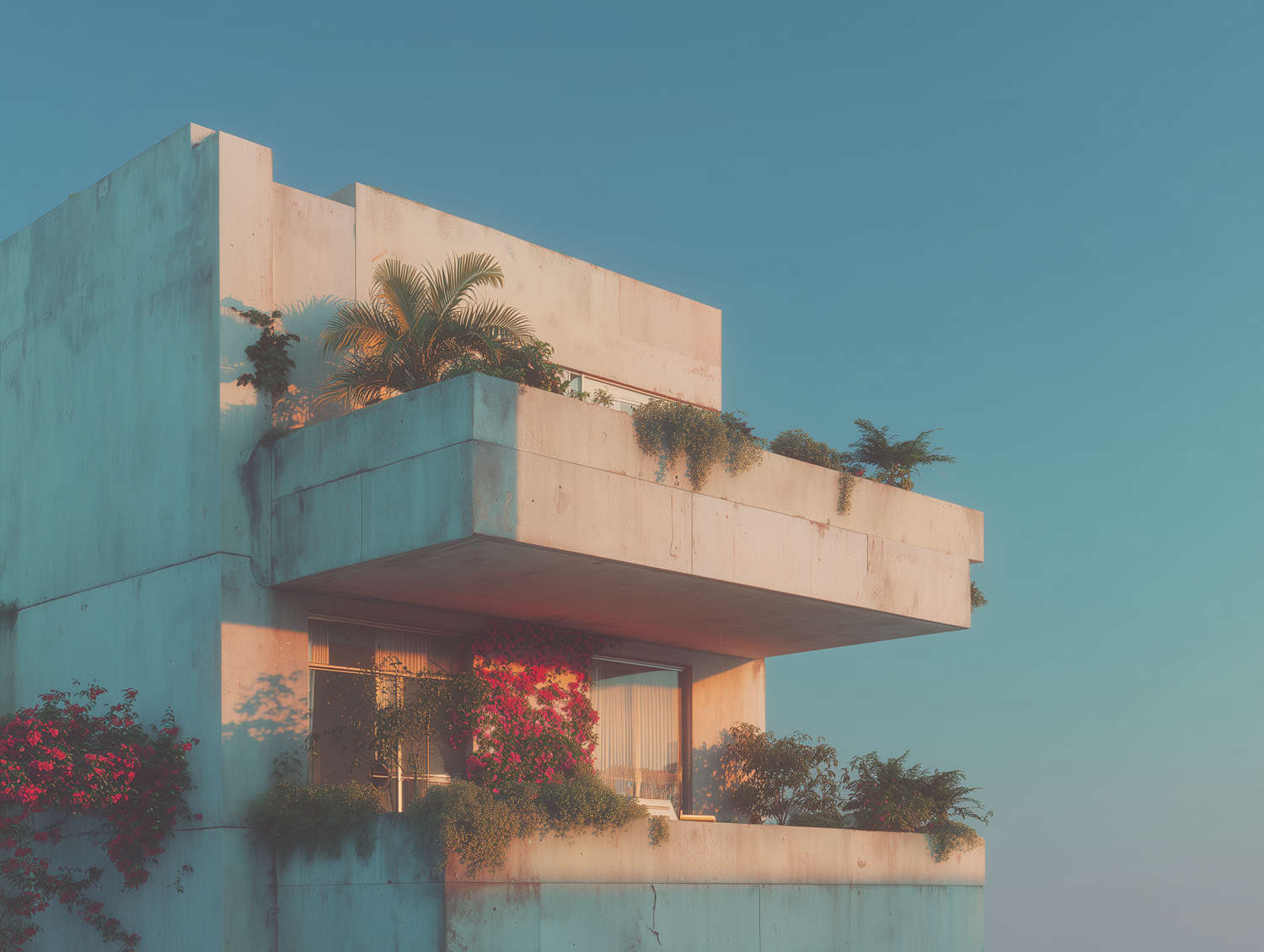 Modern concrete building with lush greenery and vibrant flowers on balconies, bathed in warm sunlight against a clear blue sky.