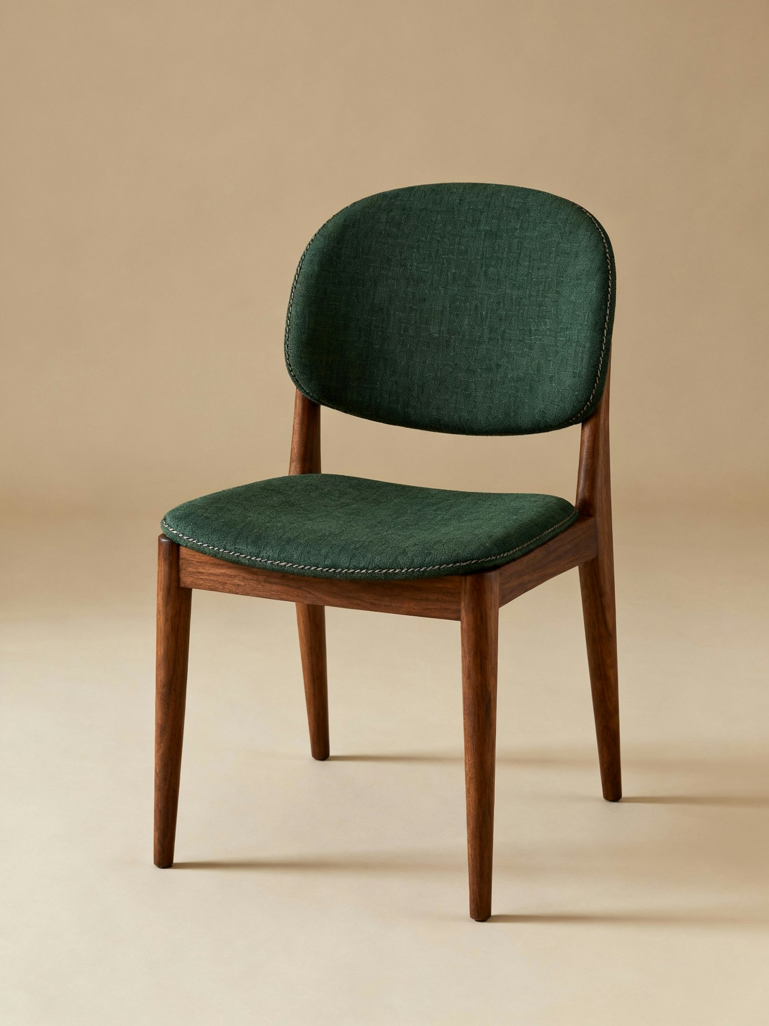 Professional studio photography, neutral beige background, soft diffused lighting, sharp focus. A mid-century modern dining chair with a solid walnut wooden frame, slightly tapered legs, and a gently curved backrest. The seat is upholstered in deep green textured fabric, with clean stitched edges. The proportions are slim and elegant, with a timeless retro-modern silhouette. Photographed straight from the front, centered composition, showing the seat and backrest symmetrically.