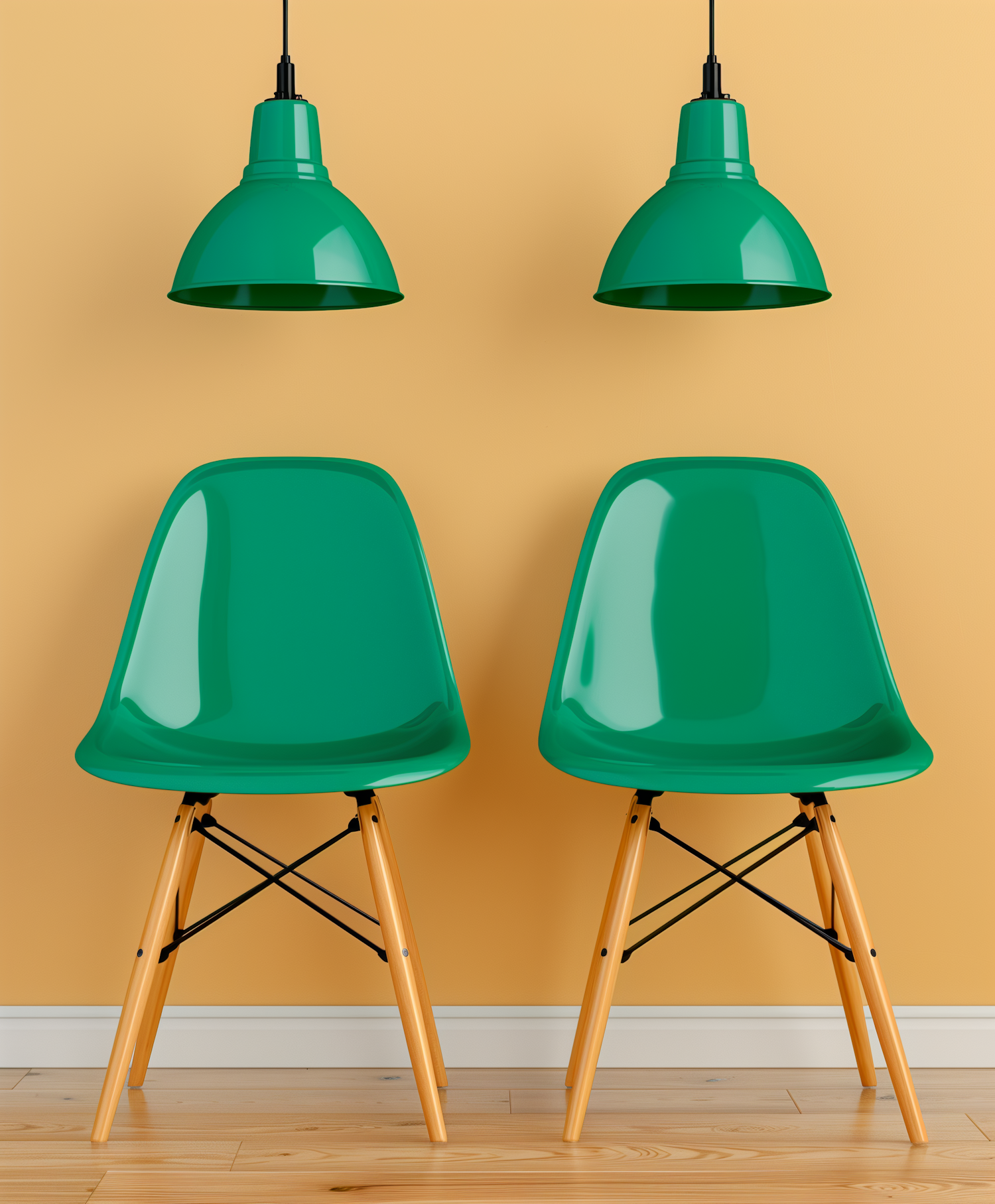 Modern green chairs with wooden legs and matching pendant lights against a mustard yellow wall. Stylish and symmetrical interior design.