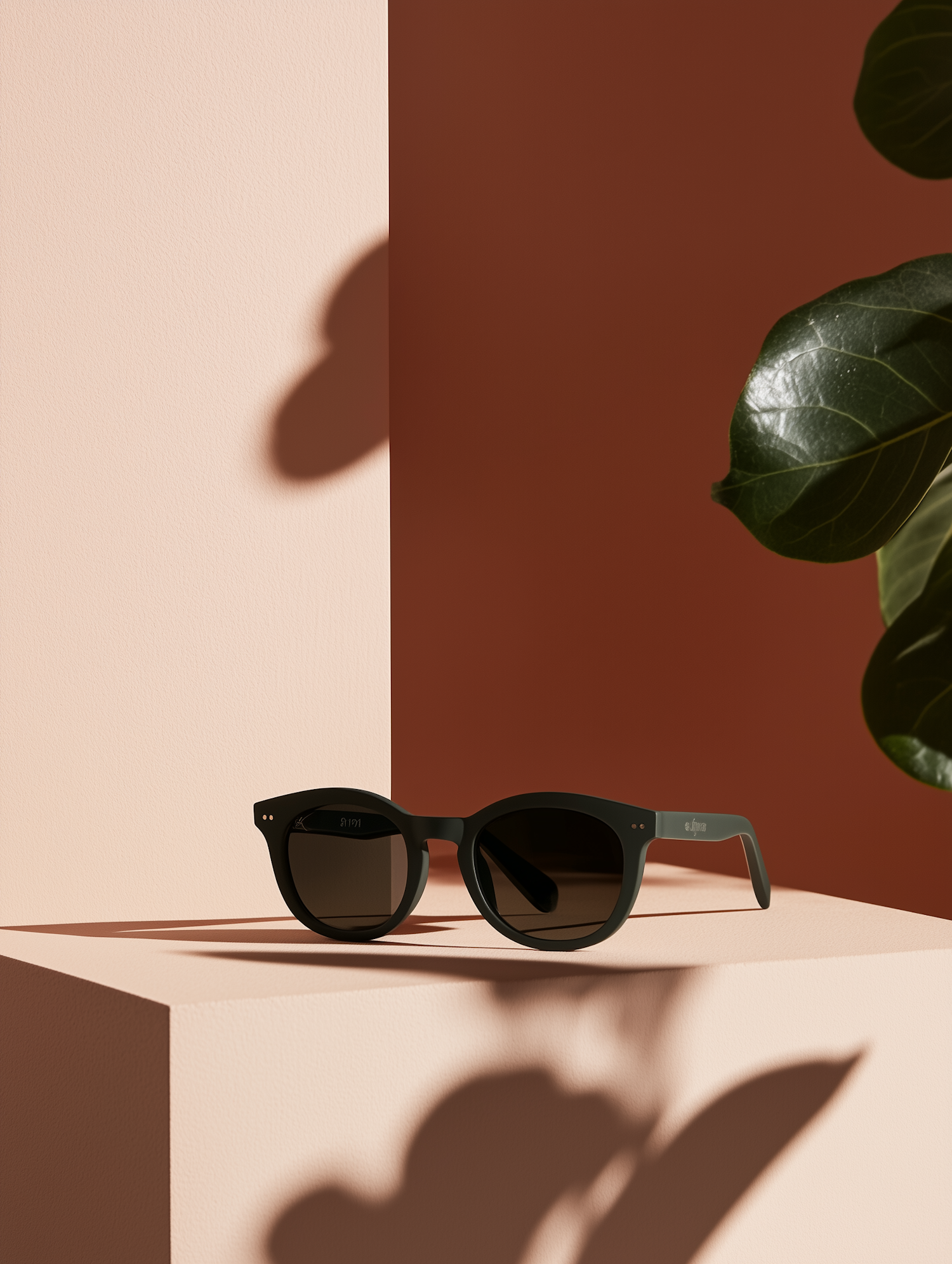 Stylish dark green sunglasses on a beige pedestal with a terracotta backdrop and leafy plant shadows for a minimalist aesthetic.