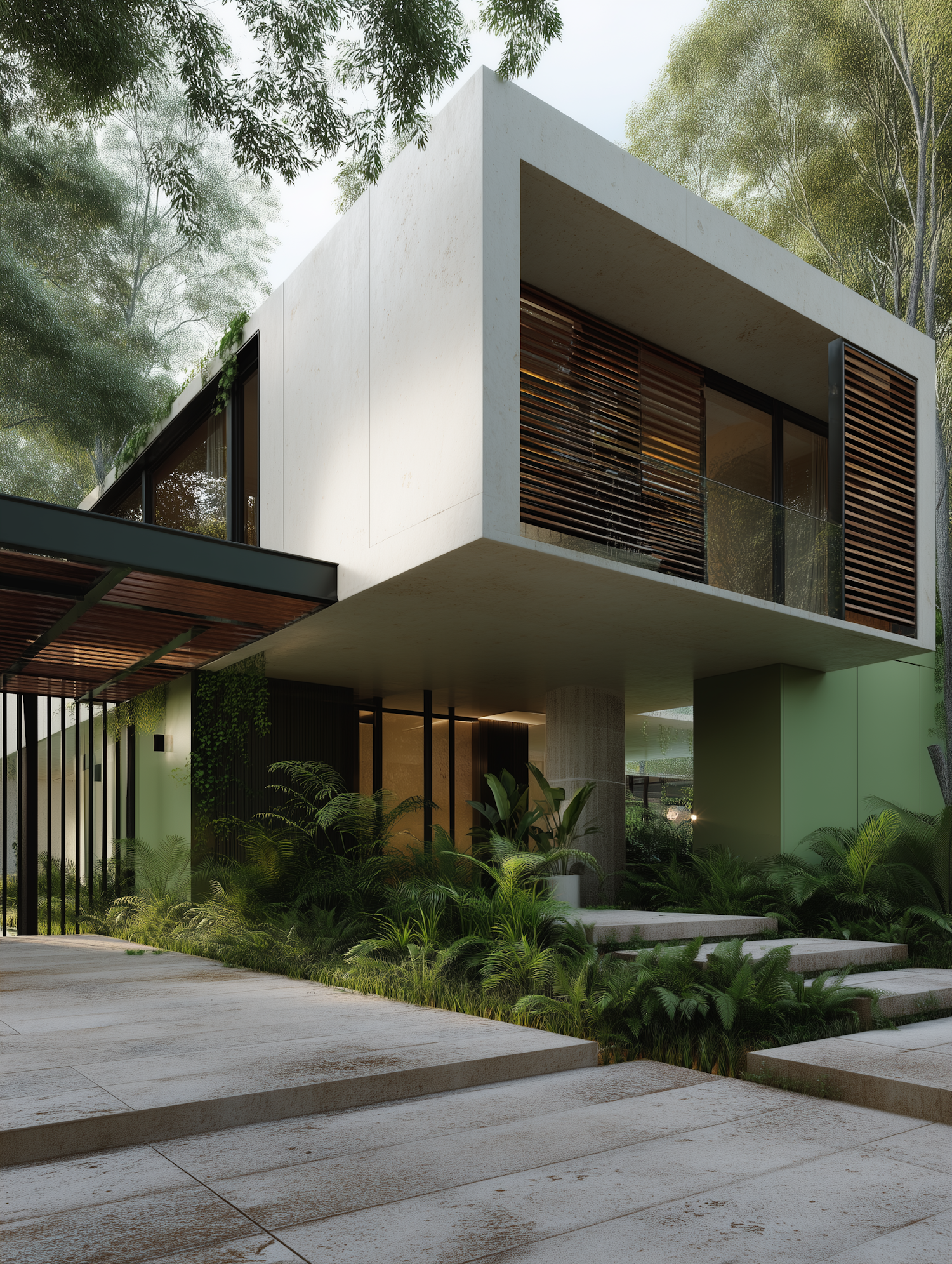 Modern minimalist home with concrete, glass, and wood accents, surrounded by lush greenery and tropical landscaping.