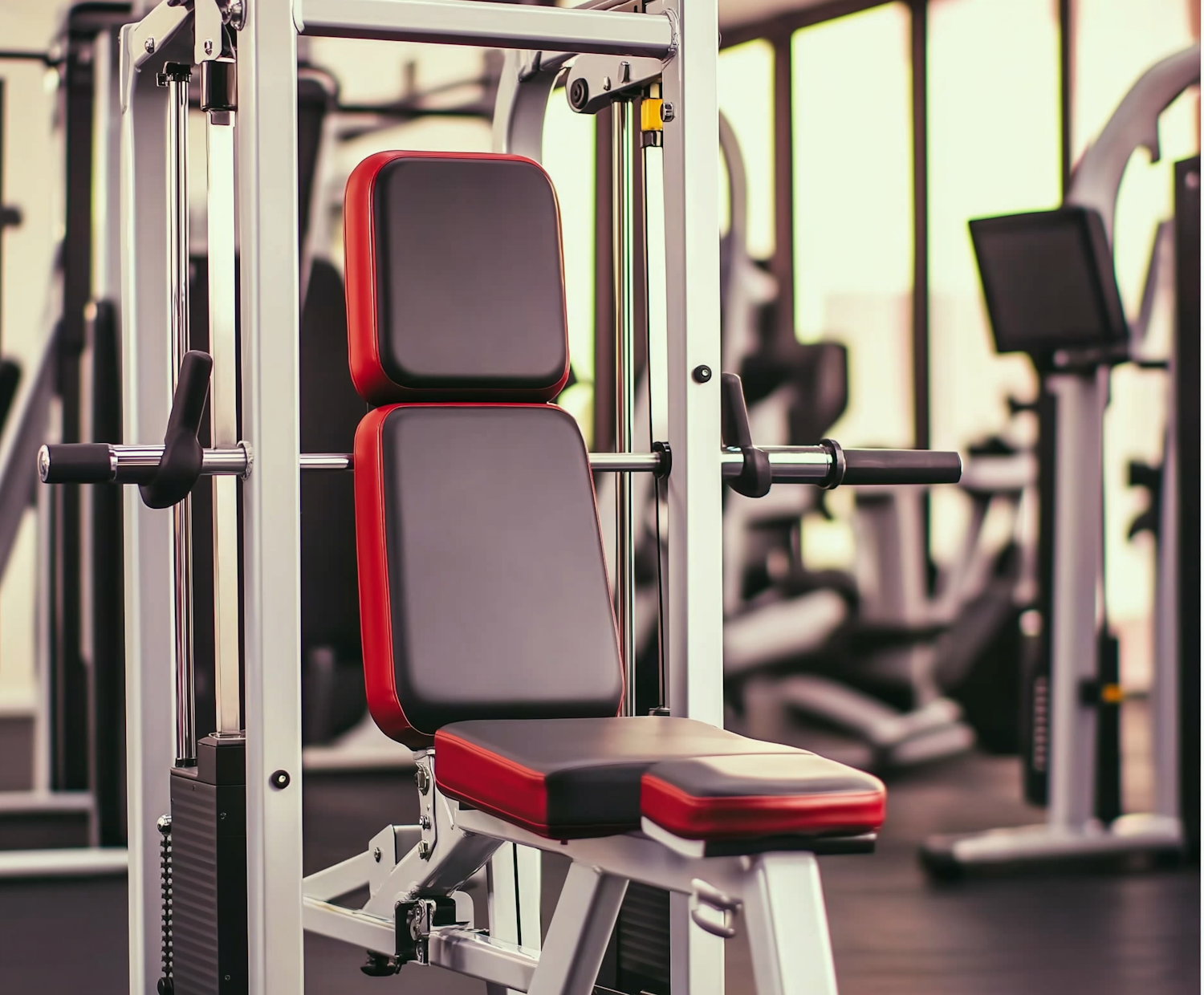 Modern gym weight machine with black and red padding, surrounded by other fitness equipment in a bright, organized setting.
