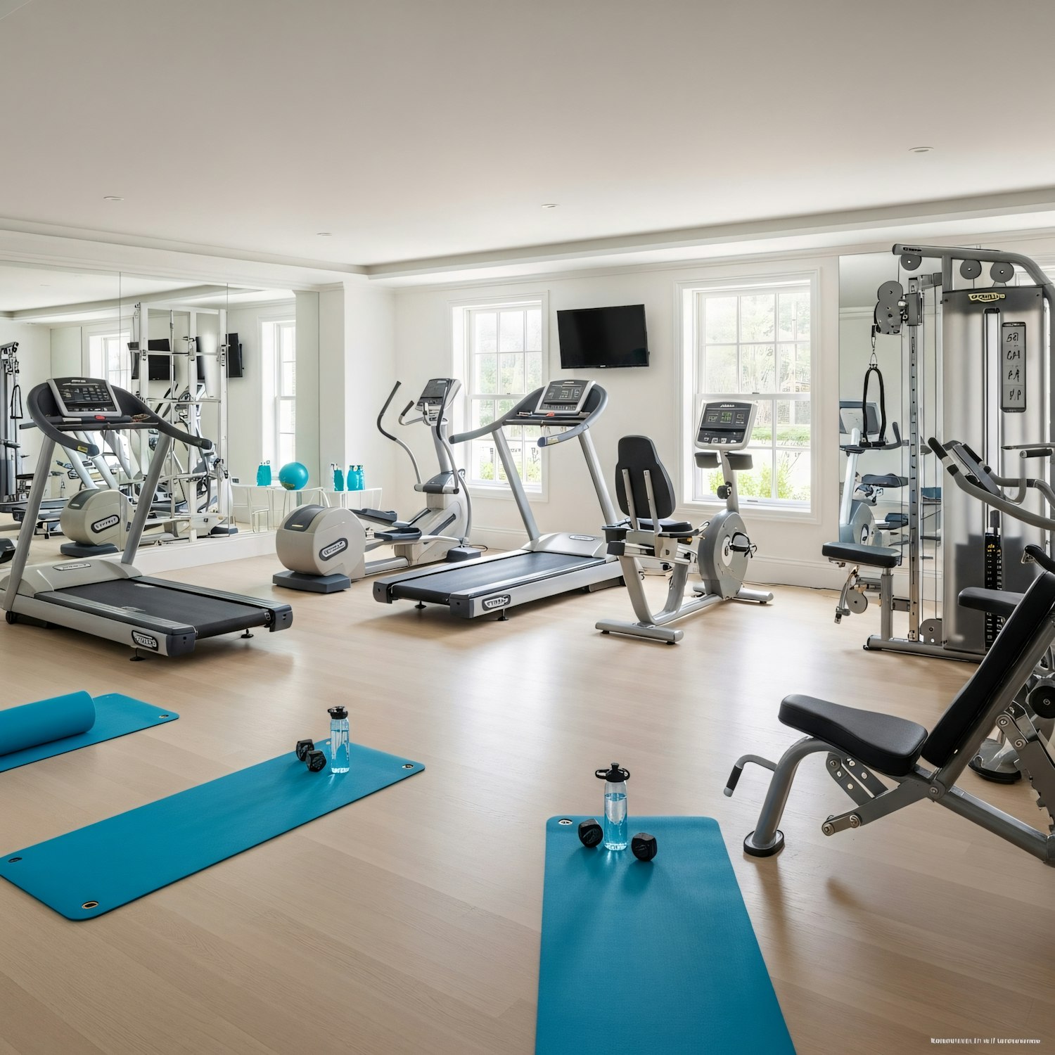 Bright and modern gym with treadmills, weights, and yoga mats, featuring large windows and a clean, organized layout.