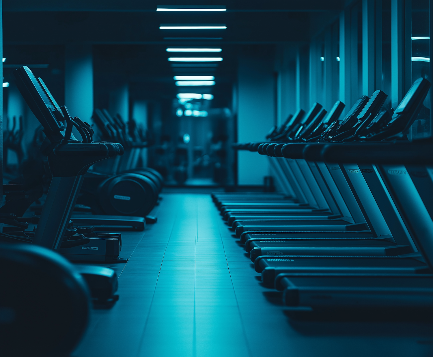 Dimly lit gym with rows of treadmills under cool blue lighting, creating a serene and modern atmosphere.