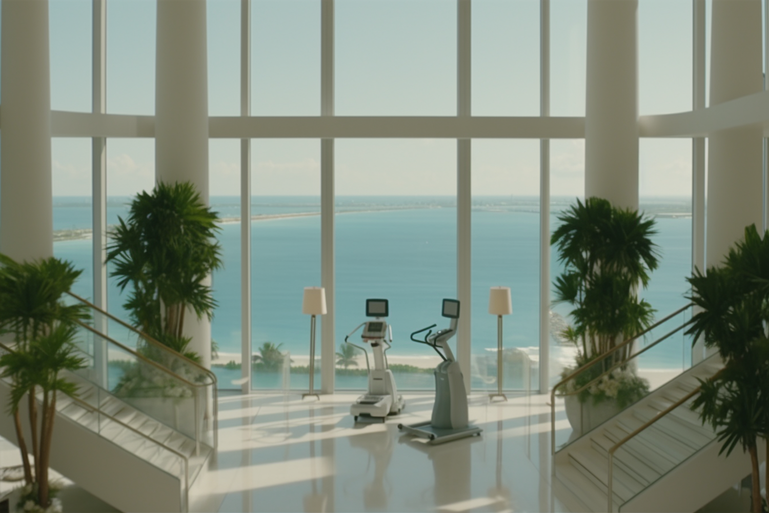 Luxurious gym with ocean view, featuring modern exercise machines and lush plants in a bright, airy space.