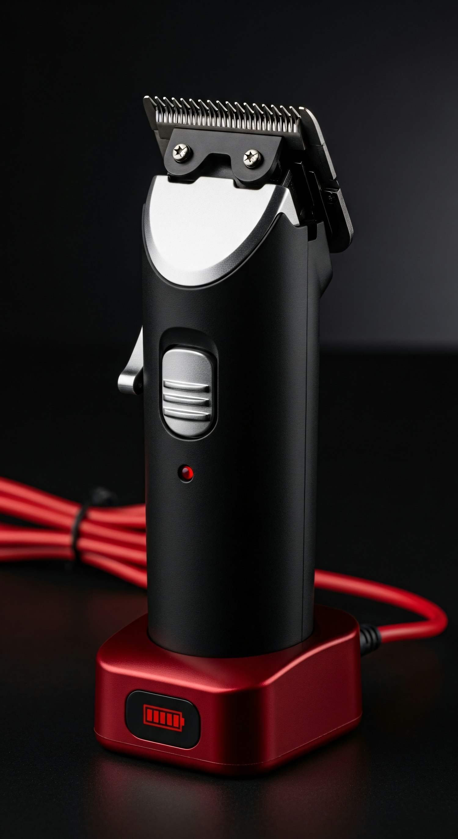 Sleek black and silver electric hair clipper on a red charging dock with a battery indicator, coiled red cord in the background.