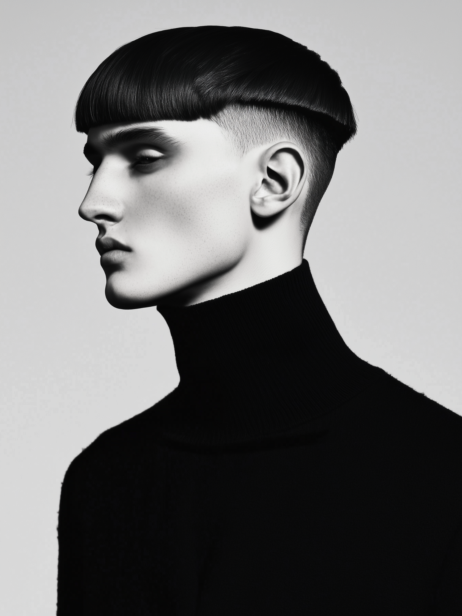 Profile of a young man with a bowl cut and black turtleneck, showcasing minimalist fashion and modern hairstyle.