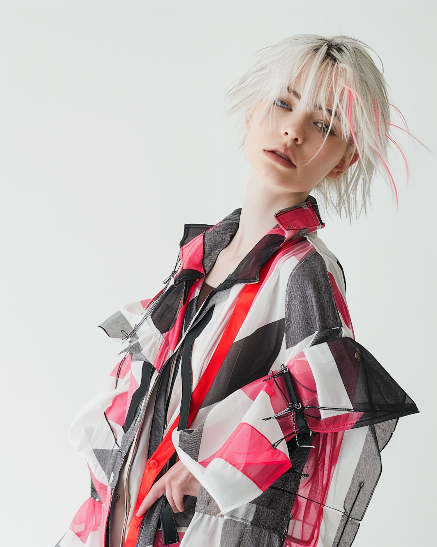 Edgy fashion portrait of a woman with platinum blonde hair and pink streaks, wearing a bold geometric outfit with sheer fabric.
