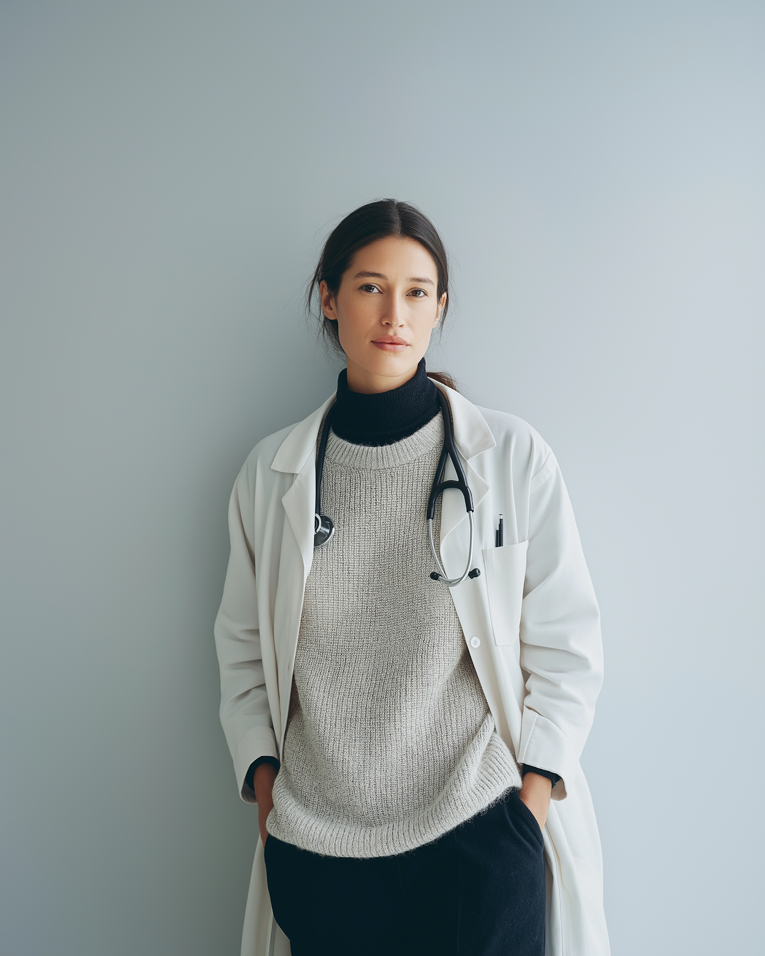 Portrait of a professional in a lab coat, with a calm demeanor and stethoscope, set against a clean, minimal background.